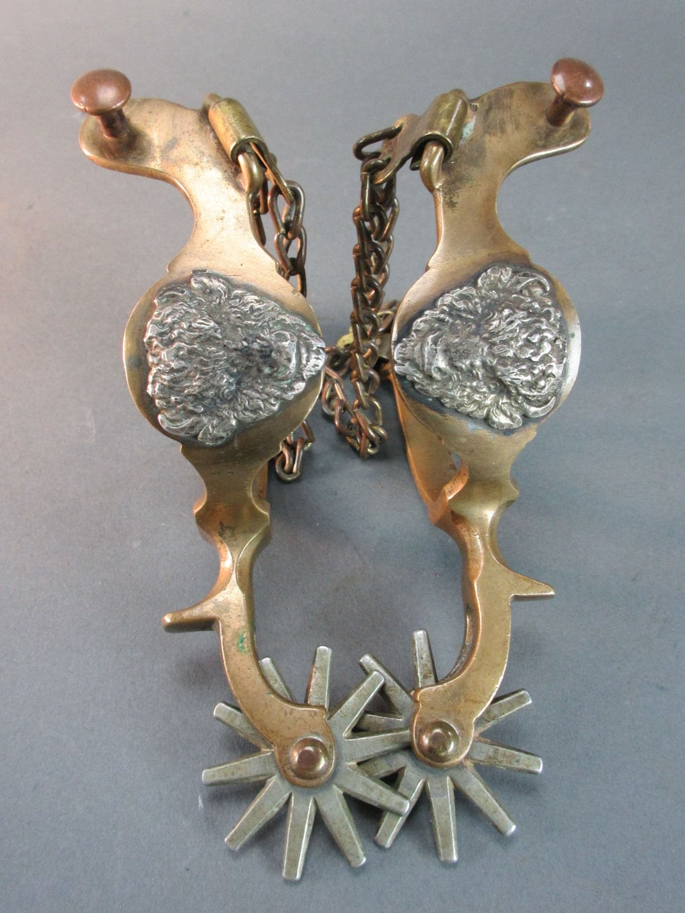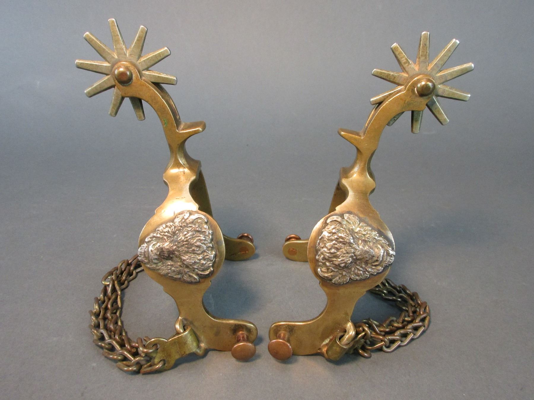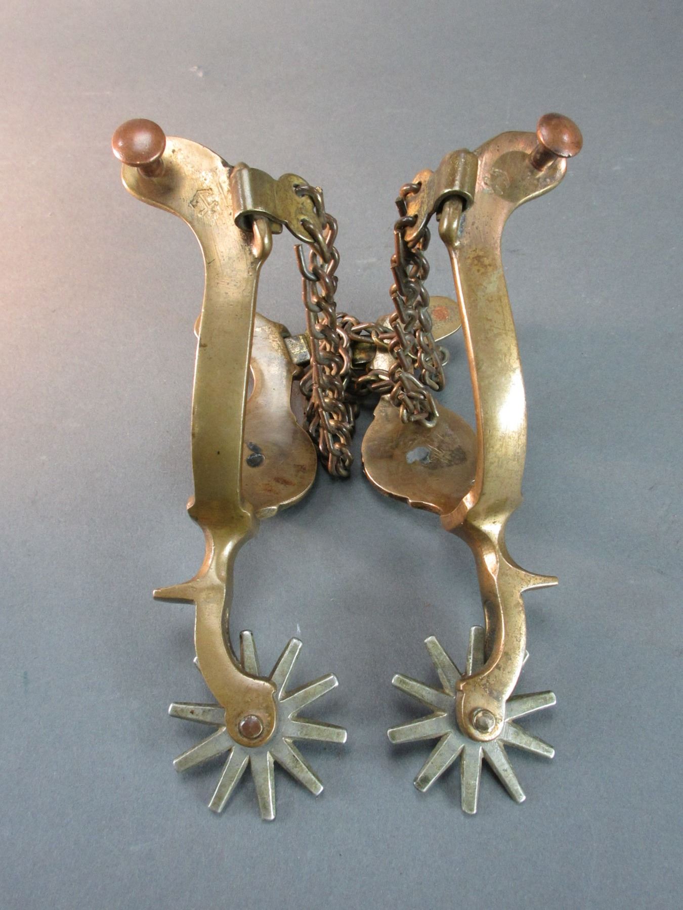 Anchor Marked North + Judd Hercules Bronze Buffalo Head Spurs- 1.5" Bands At The Widest- 2" Shanks- 10 Point Rowels- Chap Guards- Double Heel Chains- Good Condition