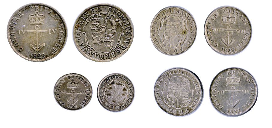 Anchor Money. Breton-858. $1/4 Dollar. CH-NC-1B1. 1822. Open ‘2’. First 2 over 2. VF; Breton-859. CH-NC-1C1. $1/8 Dollar. 1822. VF. (2 pcs.). Breton-860. $1/16 Dollar. CH-NC- 1D1. 1822 Open ‘8’. EF. Lot of four (4) pcs.