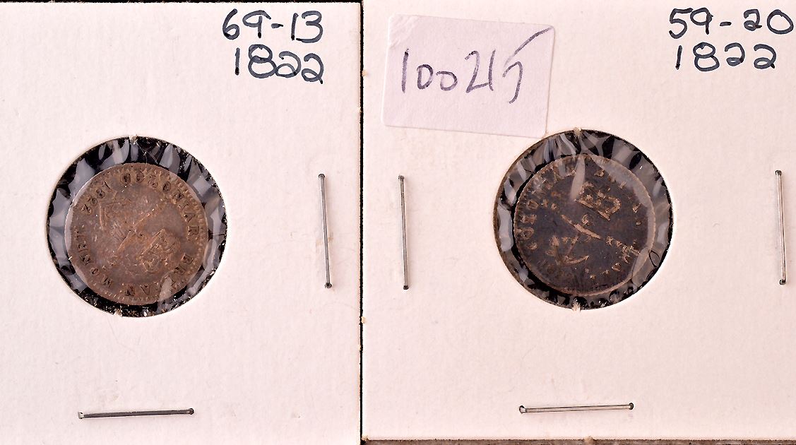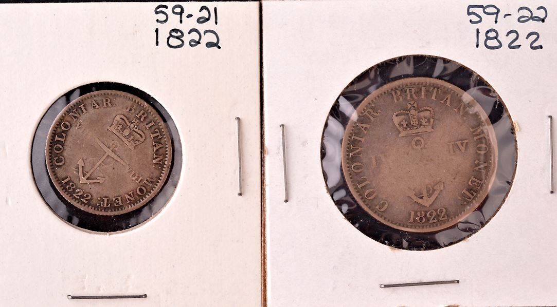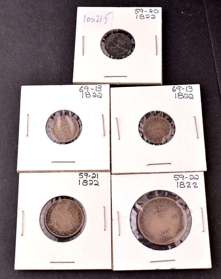 Anchor Money, 1/16 Dollar, (3), VF; 1/8 Dollar, F; 1/4 Dollar, VG; All dated 1822, total of 5 coins.