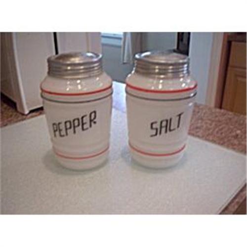 This is a barrel shaped milk glass range salt shaker which has red and black stripes and lettering. I think these were made by Anchor Hocking. The colors are bright with only minor scratches to the paint as seen in the pictures. No chips or cracks are noted. The shaker is about 4-5" tall. The tops look to be original and do have a couple of tiny dings, nothing major. A great addition to your collection or to use everyday so don't let it pass you by. <BR><BR>