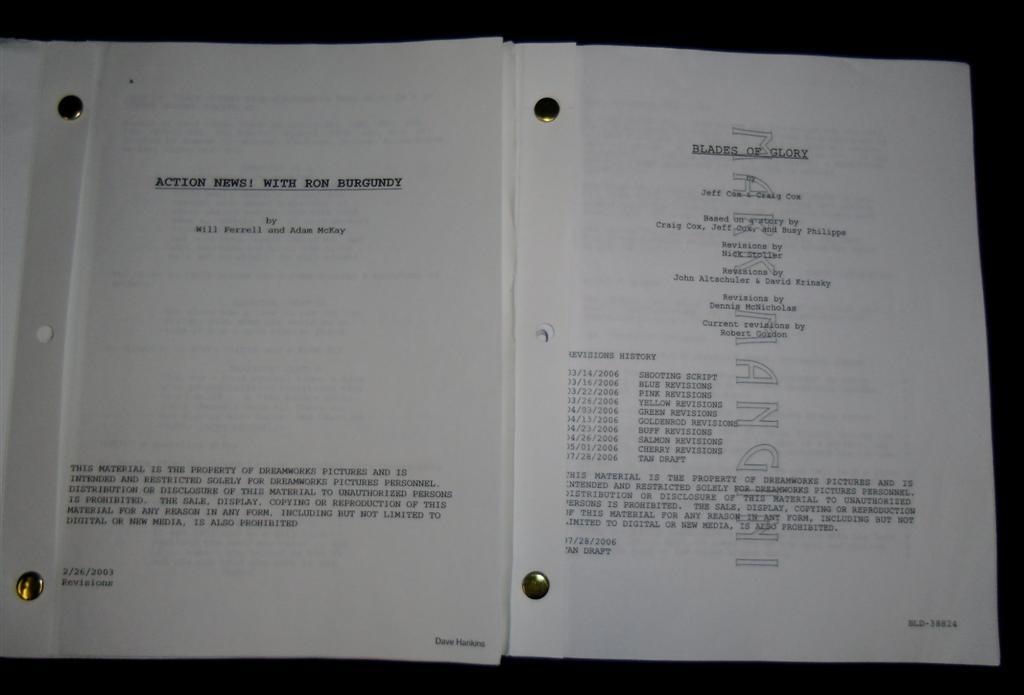 Anchorman: The Legend of Ron Burgundy (2004) and Blades of Glory (2007) - Two original production screenplays of films starring Will Ferrel. Anchorman was originally titled "Action News! With Ron Burgundy", written by Will Ferrell and Adam McKay, and dated 2/26/03. Blades of Glory, written by Jeff and Craig Cox, and dated 7/28/06 with security name stamp. Both drafts in Amblin covers.
