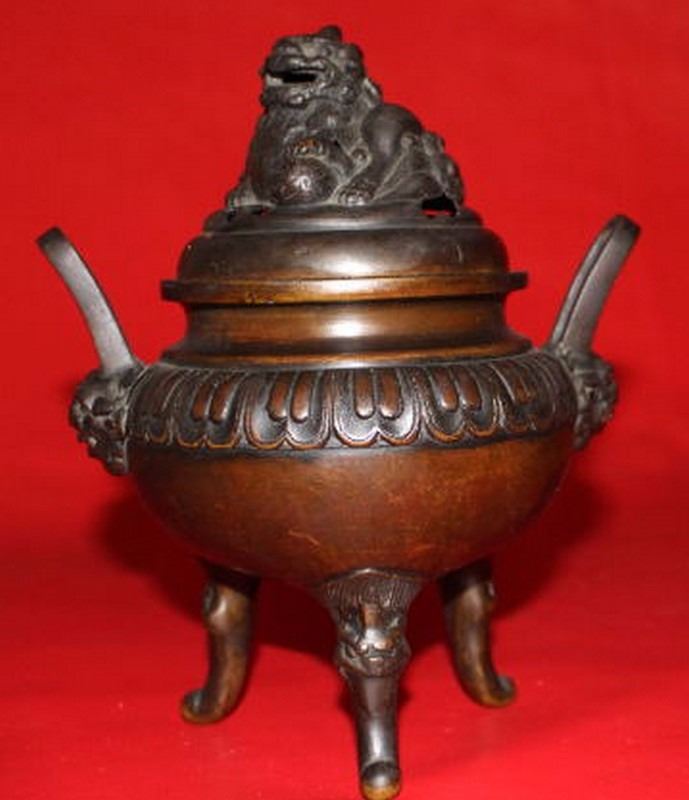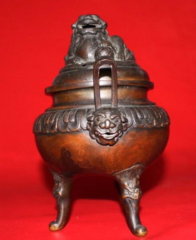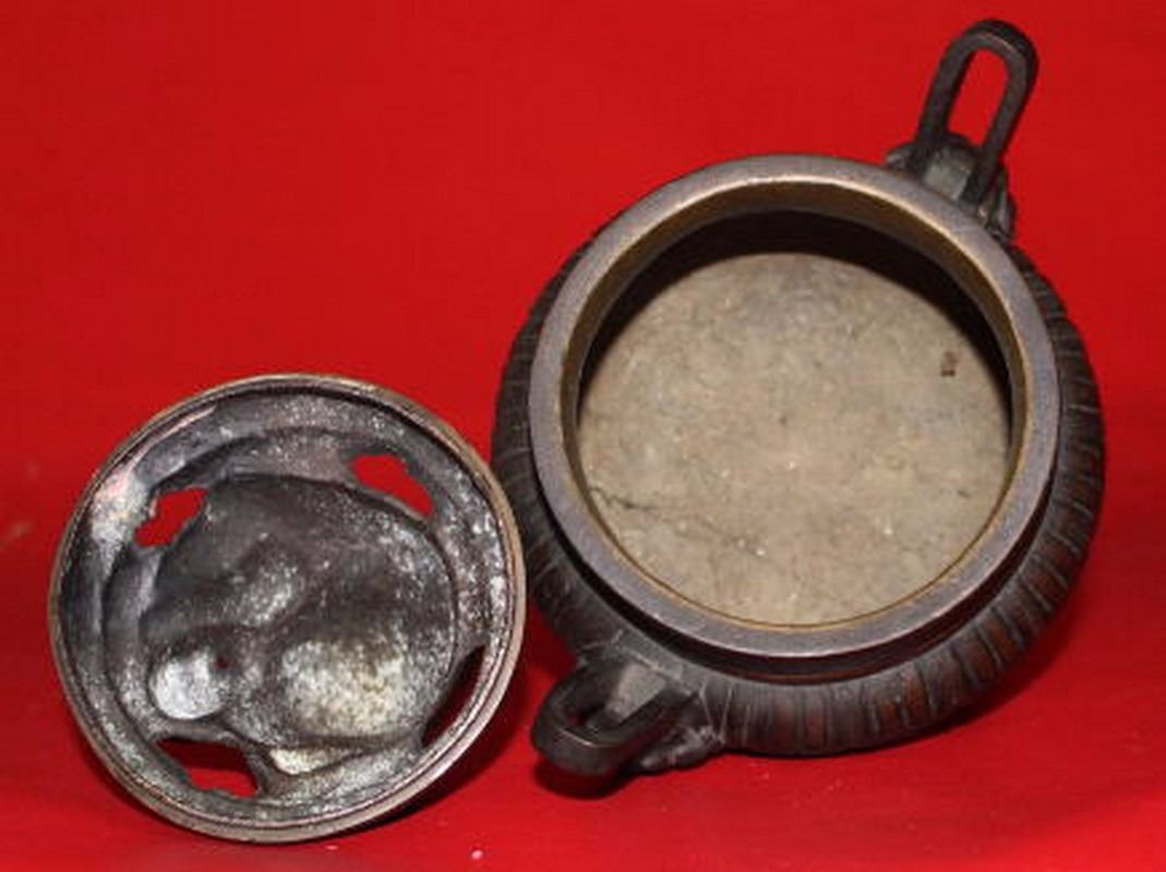 Ancient Chinese Bronze Tripod Censer with Cover with open-work cut-outs 8x7", 3-lbs