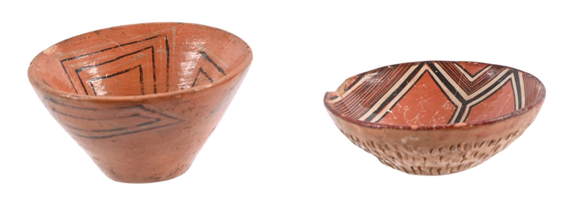Two small Anasazi polychrome pottery vessels, 1" x 3.5" and 3" x 3.5".