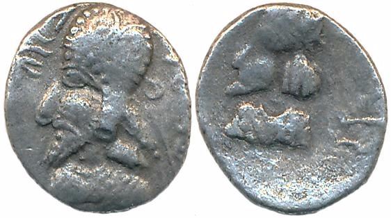 Kingdom of Persis, Napad, Silver Diobol, 1.03g, Obv: Bearded Bust left wearing Parthian style tiara, Rev: Diademed Bust left, Aramaic legend around. Very fine, rare.