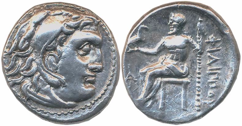 Kingdom of Macedonia, Alexander III, Silver Drachma, 4.32g, Obv: Head of young Herakles to right, wearing lion’s skin, Rev: Zeus holding an eagle and sceptre, sitting to left on a throne facing left, Greek legend behind. Very fine+, rare.