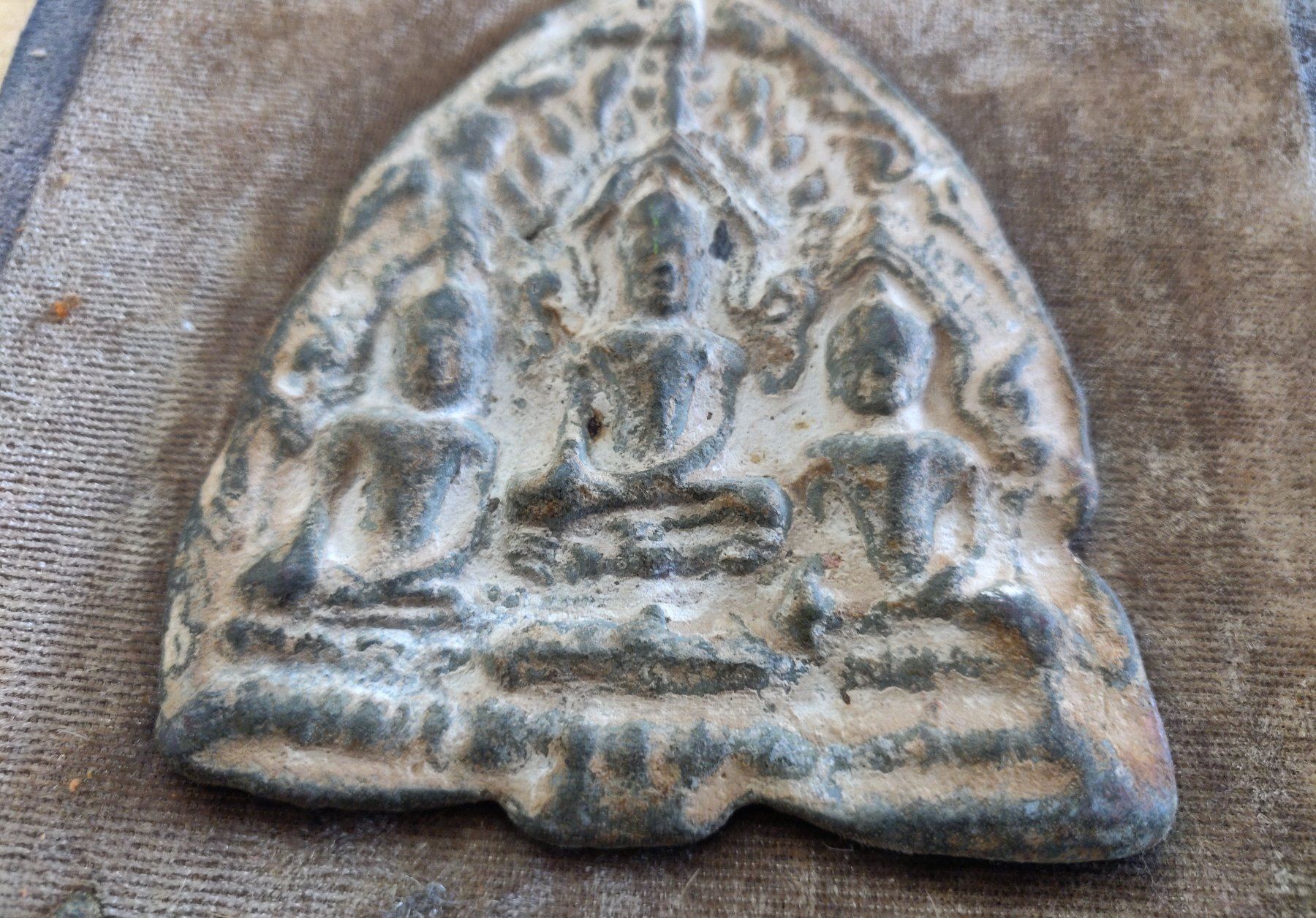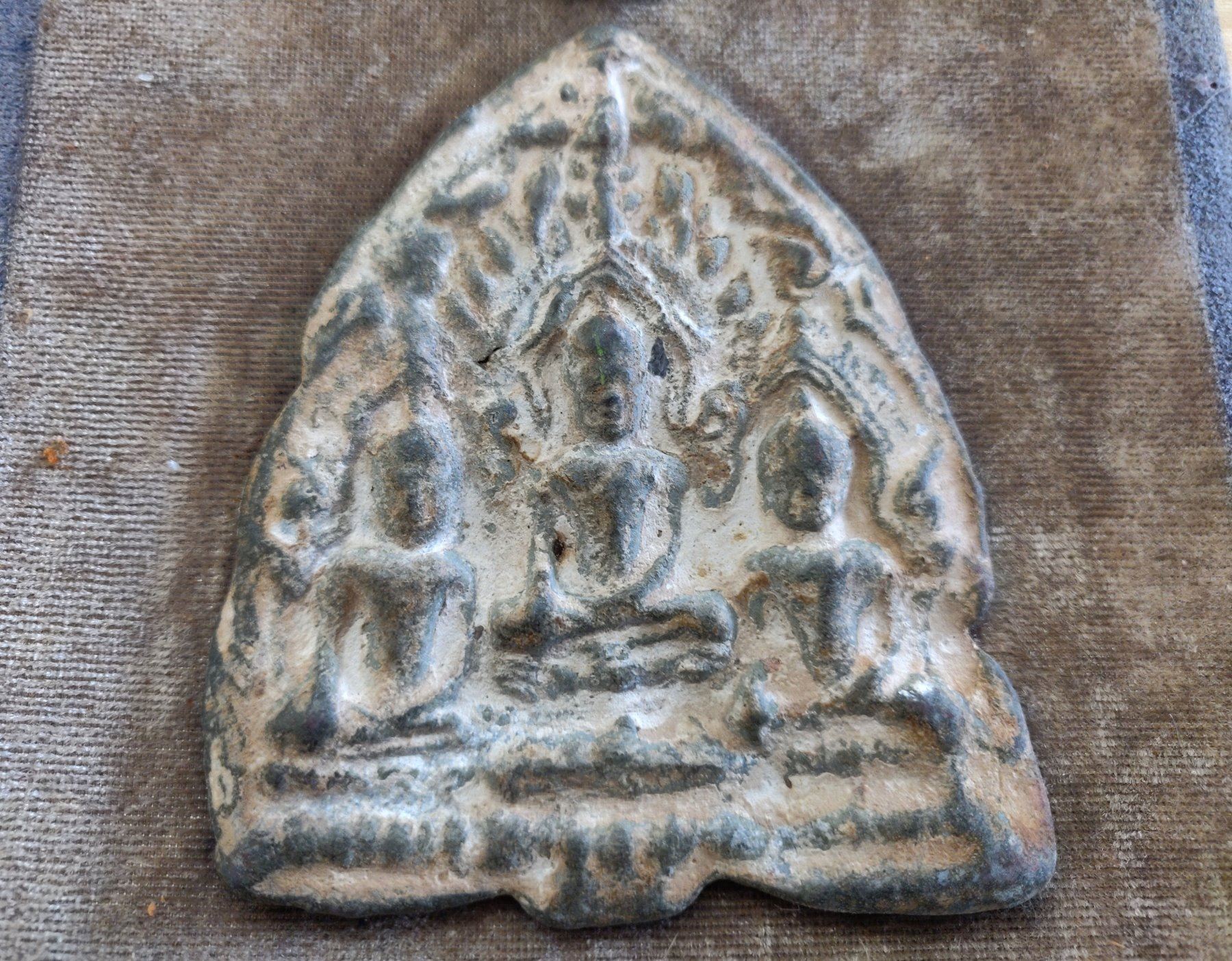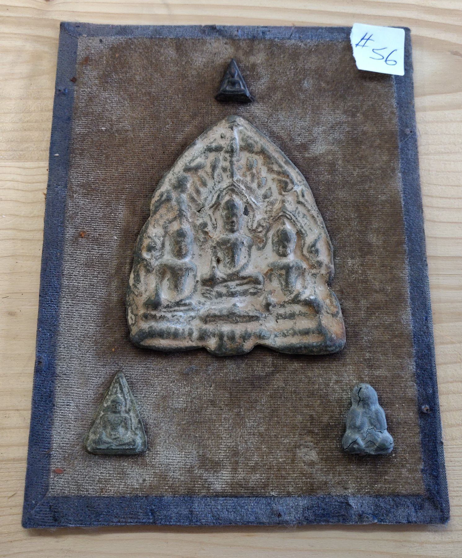 Ancient Buddha Plaque, c. 1600s. Made of soft metal, the plaque measures 6" x 8". Collection of early Buddha figures. Possibly from Thailand. Condition: Heavy patina, see images. Shipping: $20.00 w/insurance and signature, due to size and value.