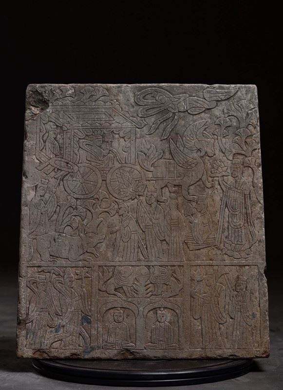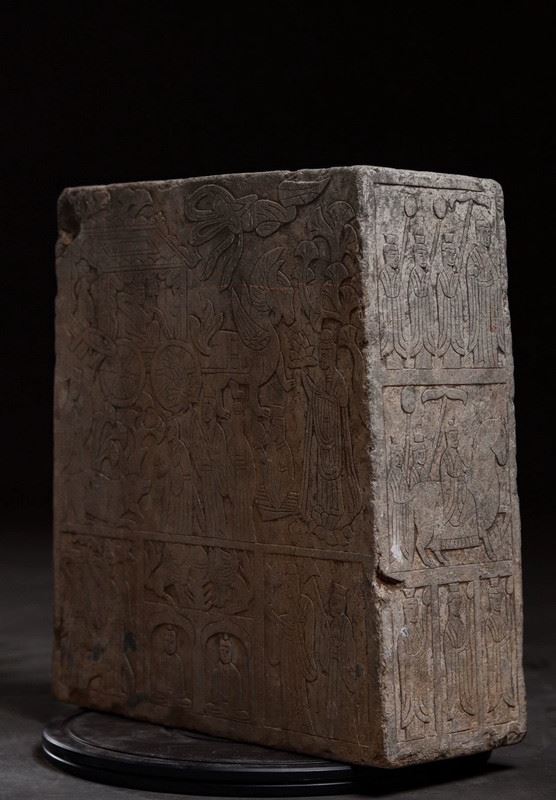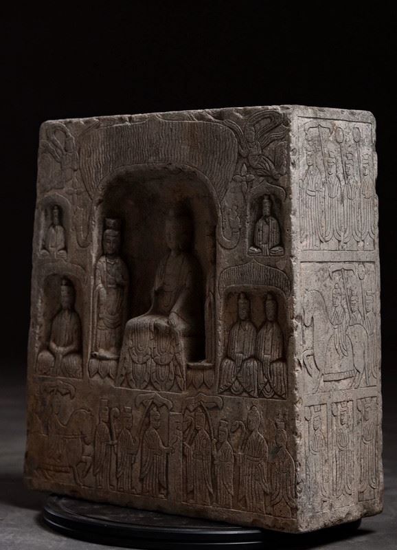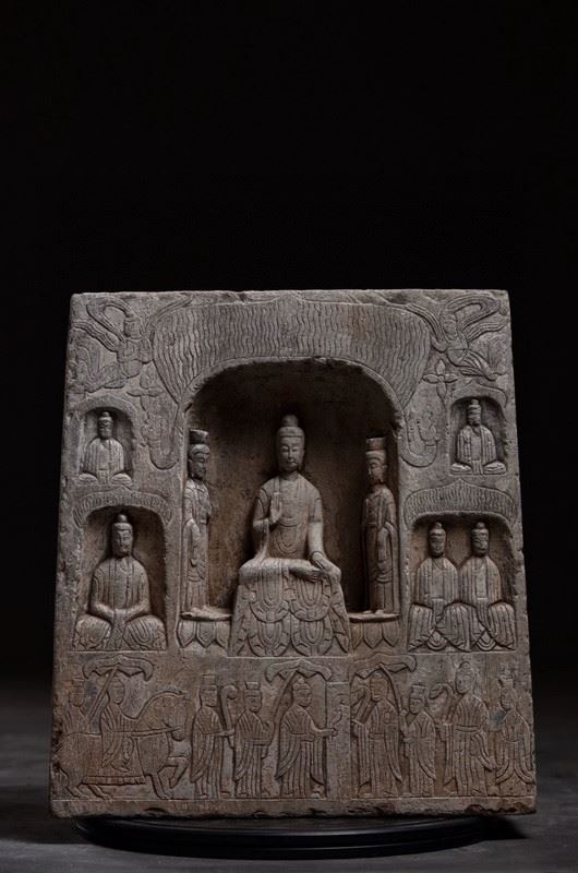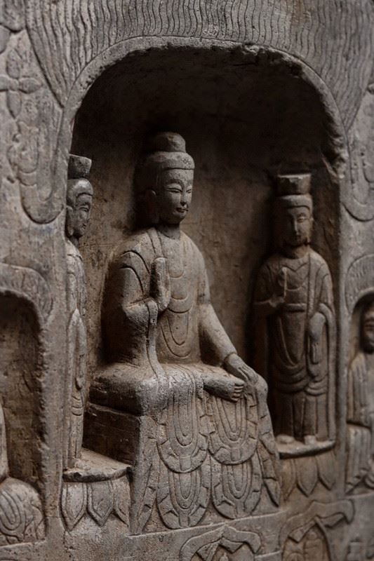 This ancient Buddha relief sculpture showcases the exquisite craftsmanship of Buddhist art. The Buddha figure sits at the center, with a dignified posture, surrounded by other deities and followers. The intricate carvings and rich religious symbolism reflect the deep heritage of Buddhist culture.