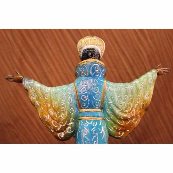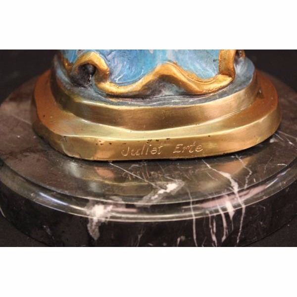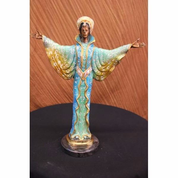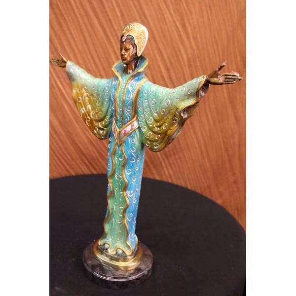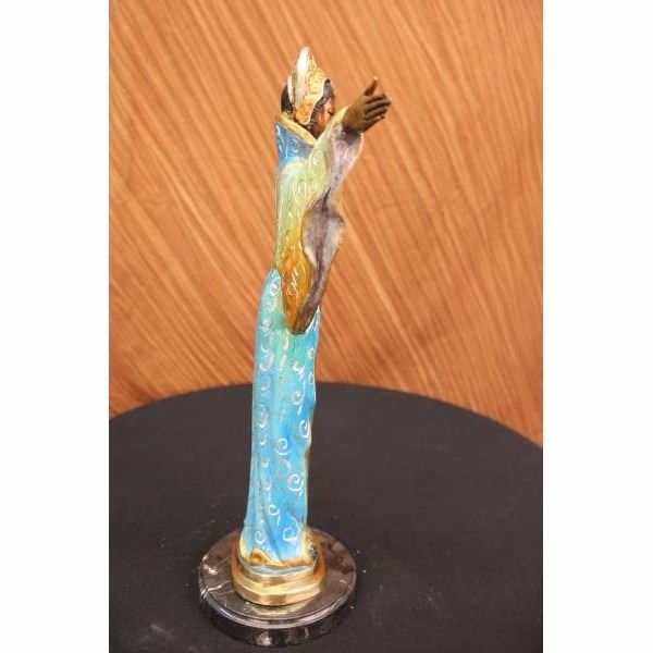 A Byzantine women prepares to Dance. She stands tall with bravery, silent confidence and stunning beauty on a grassy hill top. Her full eagle-feather and beaded war bonnet covers her head. The feathers round her head, fully extended upright. 100% bronze and handmade, this sculpture was cast using the “Lost Wax Method†and is mounted on a round black marble base. Condition: This sculpture is in perfect condition. Bronze Dimensions with Marble Base:Height 19" x Width 15" Marble Dimensions:Diameter 6" Height without base: 18" Weight :10 LBS Inventory : 67-97080NA11076