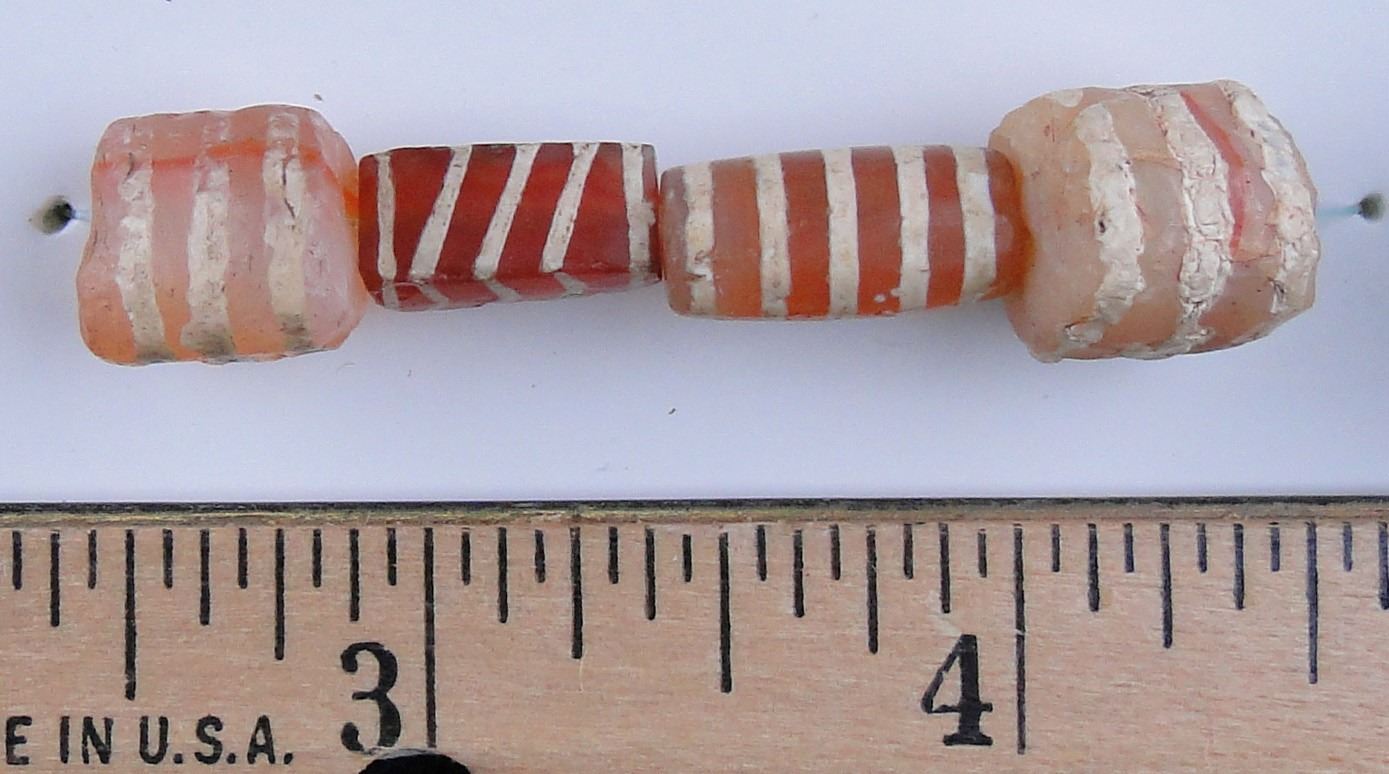 Description: Seven ancient carnelian beads with incised white decoration, attributed by Mr. Opitz to the Parthian Empire (247 B.C.-224 A.D.). All illustrated in NNP edition, p. 63 bottom right and p. 64 top left.