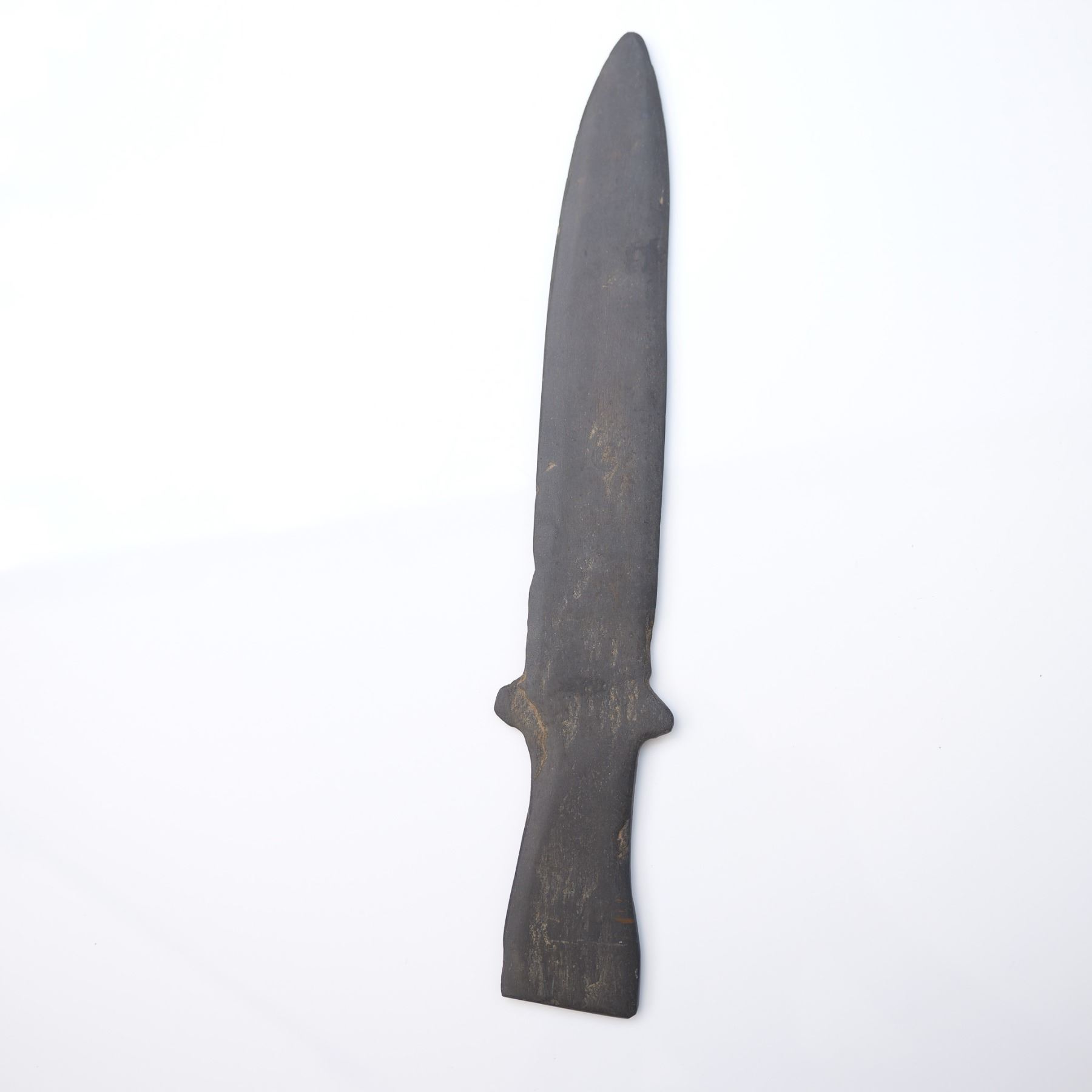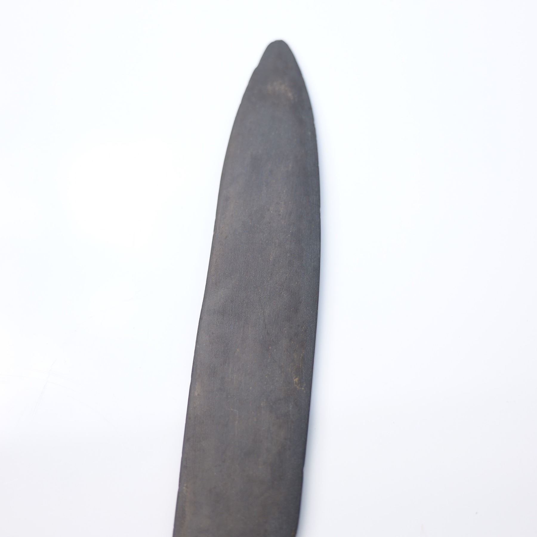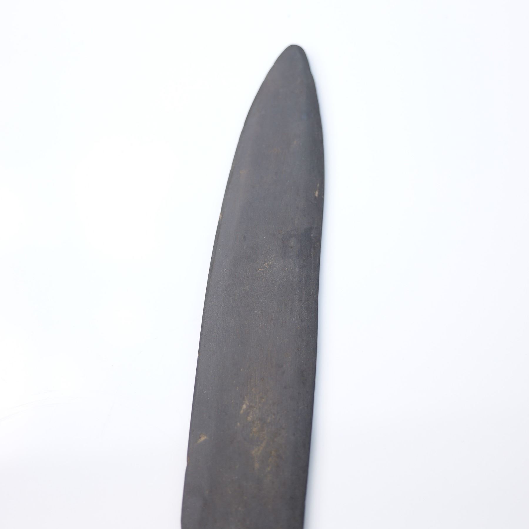 A carved stone blade with elongated proportions, likely intended for ceremonial or ritual use. This artifact is crafted from dark, fine-grained stone, possibly slate or a similarly workable material. The blade tapers to a rounded point and features slightly convex edges, transitioning into a carefully integrated handle section. The handle is broad and squared at the end, with subtle shoulders and a midsection pinch suggesting ergonomic shaping. The blade surface is finely ground and smoothed. Both the blade and handle are uniformly finished with rounded contours and a matte polish.