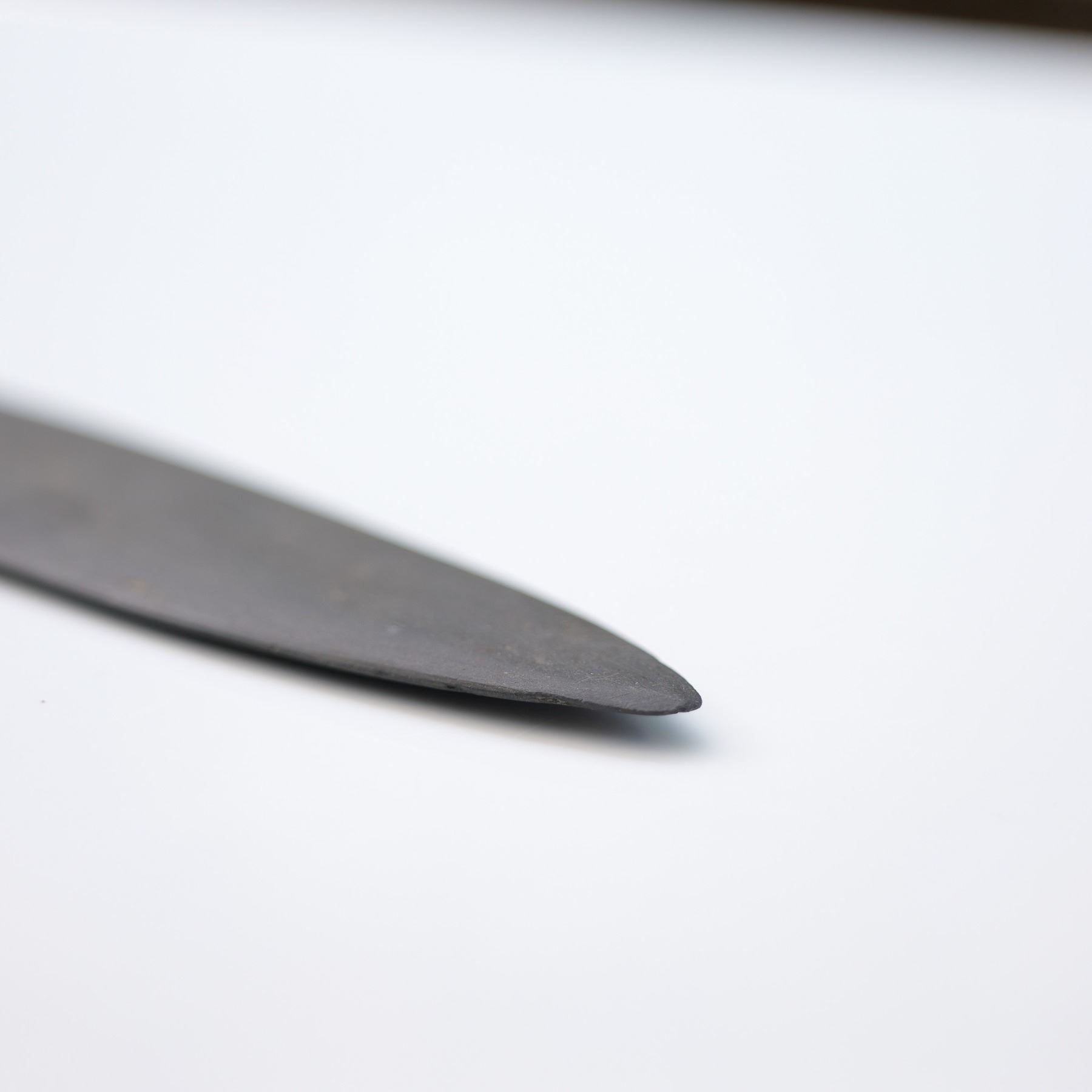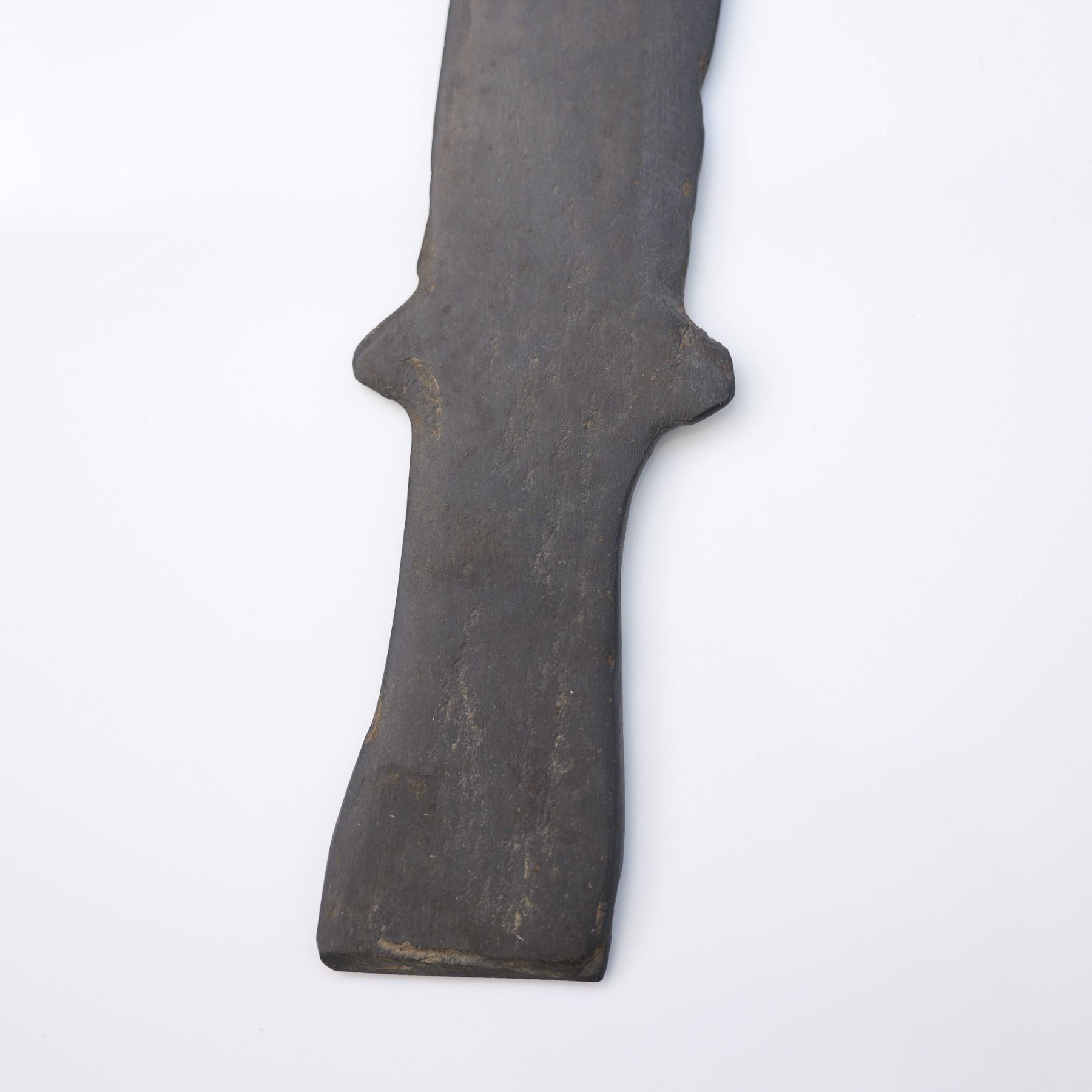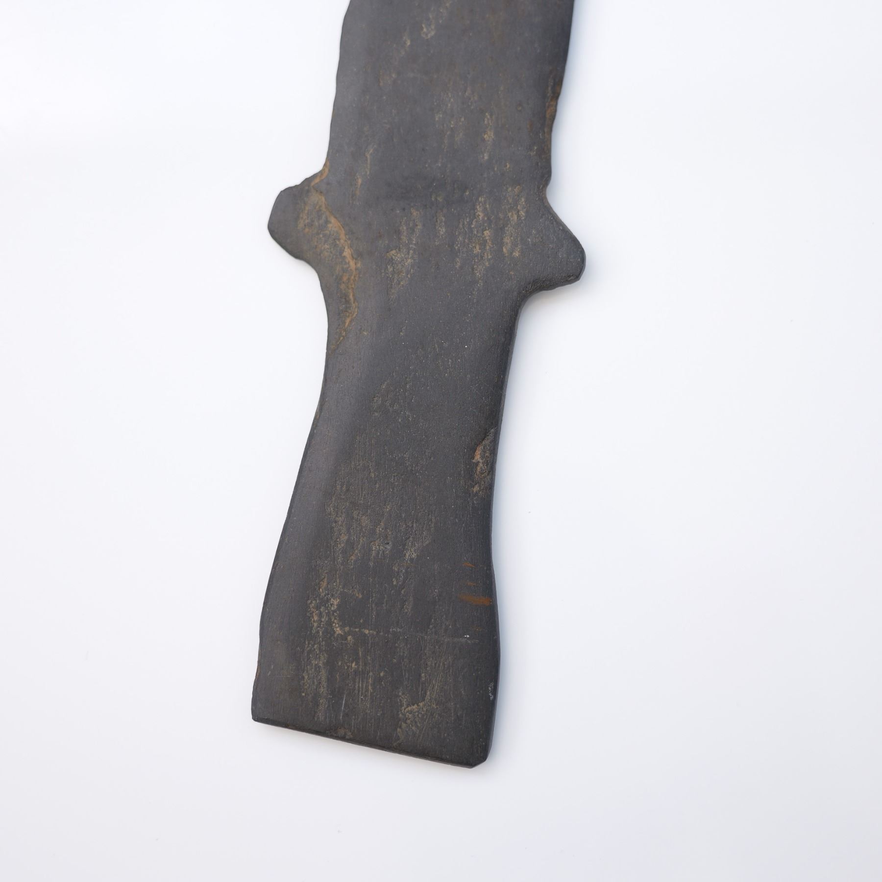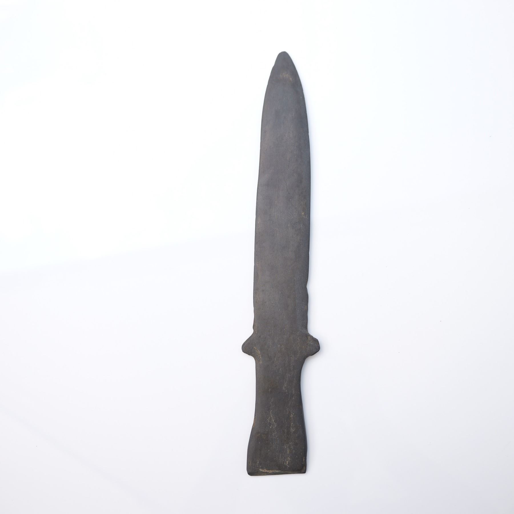 A carved stone blade with elongated proportions, likely intended for ceremonial or ritual use. This artifact is crafted from dark, fine-grained stone, possibly slate or a similarly workable material. The blade tapers to a rounded point and features slightly convex edges, transitioning into a carefully integrated handle section. The handle is broad and squared at the end, with subtle shoulders and a midsection pinch suggesting ergonomic shaping. The blade surface is finely ground and smoothed. Both the blade and handle are uniformly finished with rounded contours and a matte polish.