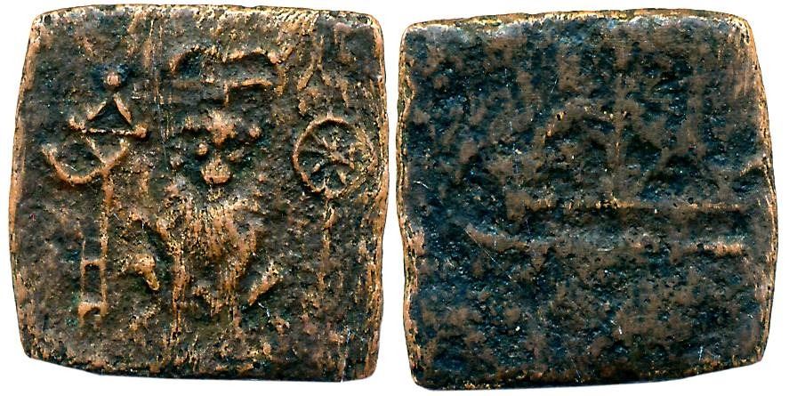 Sangam Cheras, Copper Square, 2.64g, Obv: Seated Lion facing front, rayed Sun above, flag on left, chakra on right, Rev: Ankush, bow & arrow. Very fine.