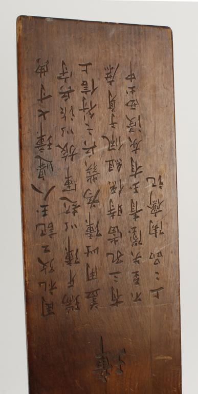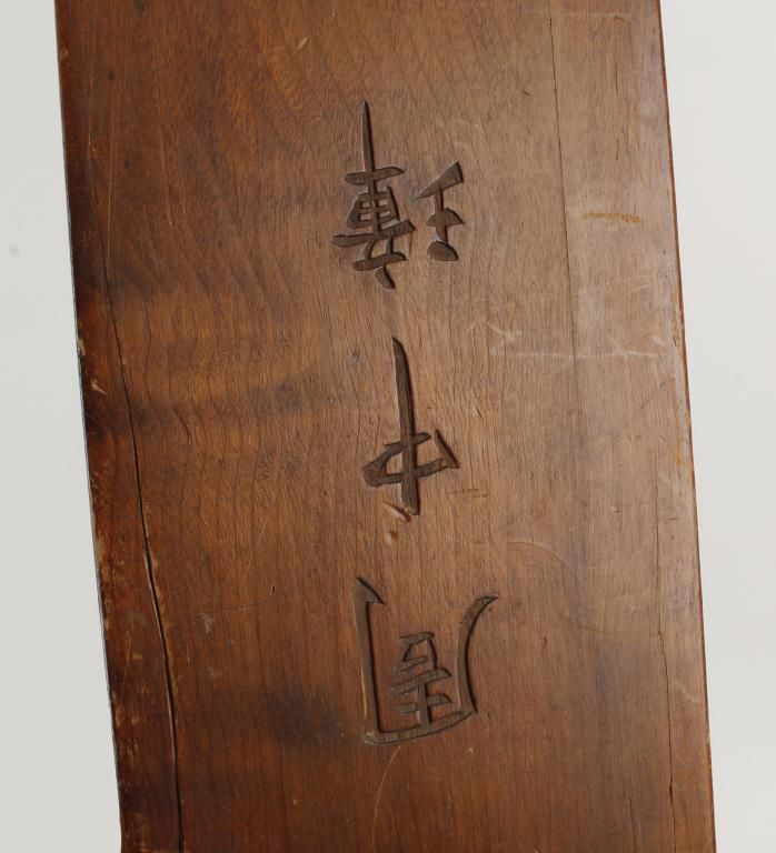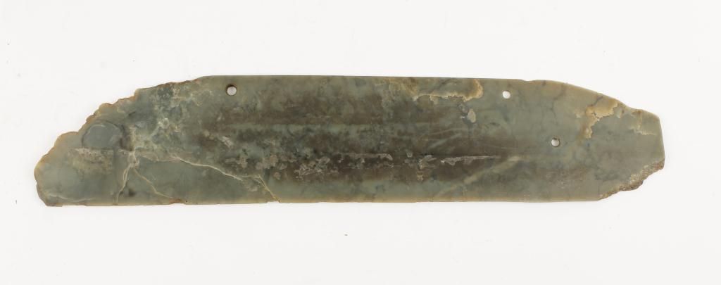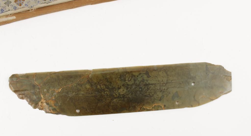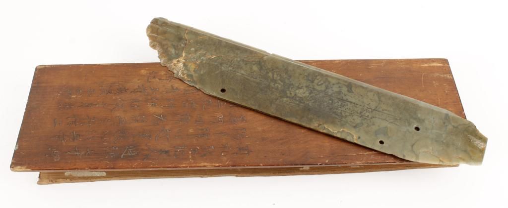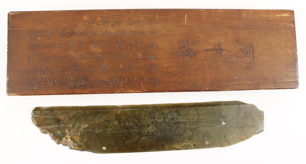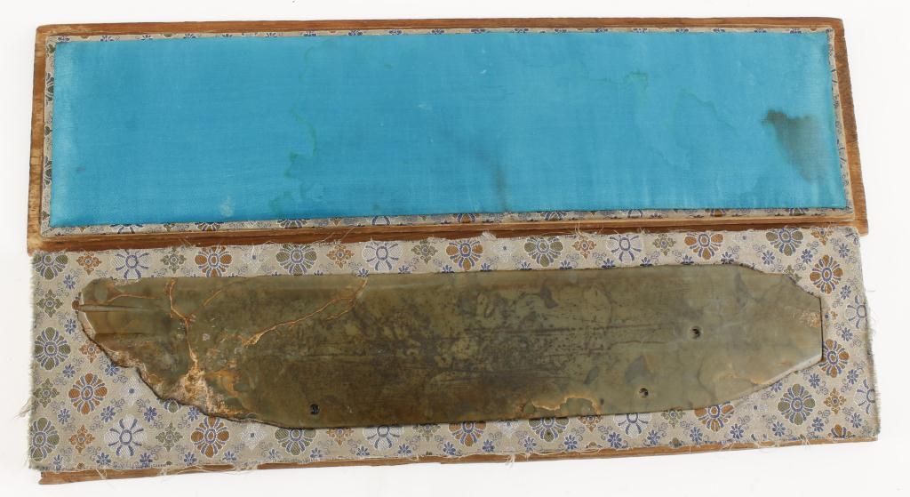 Measures 15 1/2"x3", holes are drilled off center in archaic fashion, some breaks and losses with fitted 20th century case with Chinese writing on lid, purchased between 1900-1930s in China and brought to New York by German immigrant family. Looks like a museum quality artifact and definitely has great age. Specifics and era unknown but possibly in the writing on lid.