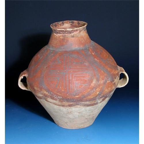 Twin-handled pottery jar, made over 4,000 years ago during the Machang Phase (c. 2300 - 2000 BC) of the Majiayao culture, also known as the Gansu-Yangshao culture, from present day Gansu or Qinghai province. The outside of the jar and the inner rim have been decorated with geometric patterns painted onto the surface with mineral-based pigment. Measuring 9-1/4" H x 9-1/2" and in good condition with restoration to a section of the upper rim and large chip from one handle. Ex Smith collection, San Diego. A nice example for the money!