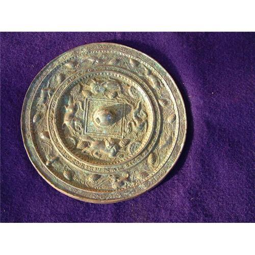 Ancient Chinese silver mirror dating to early Tang period. The obverse is decorated in the central round panel with 4 mythological animals alternating with raised grape clusters. There are 3 circular bands, the central one being the widest and decorated with 5 mythological animals. The outer circular band is decorated with an elaborate ornamental scroll. The inner circle has archaic characters in high relief. A square representing the earth, encompasses the central knob. We believe that this is an imperial funerary mirror due to the fact that has 9 mythological animals and the 4 mythological animals in the central panel, represent the emperor demise. Estimated value: $2.500.