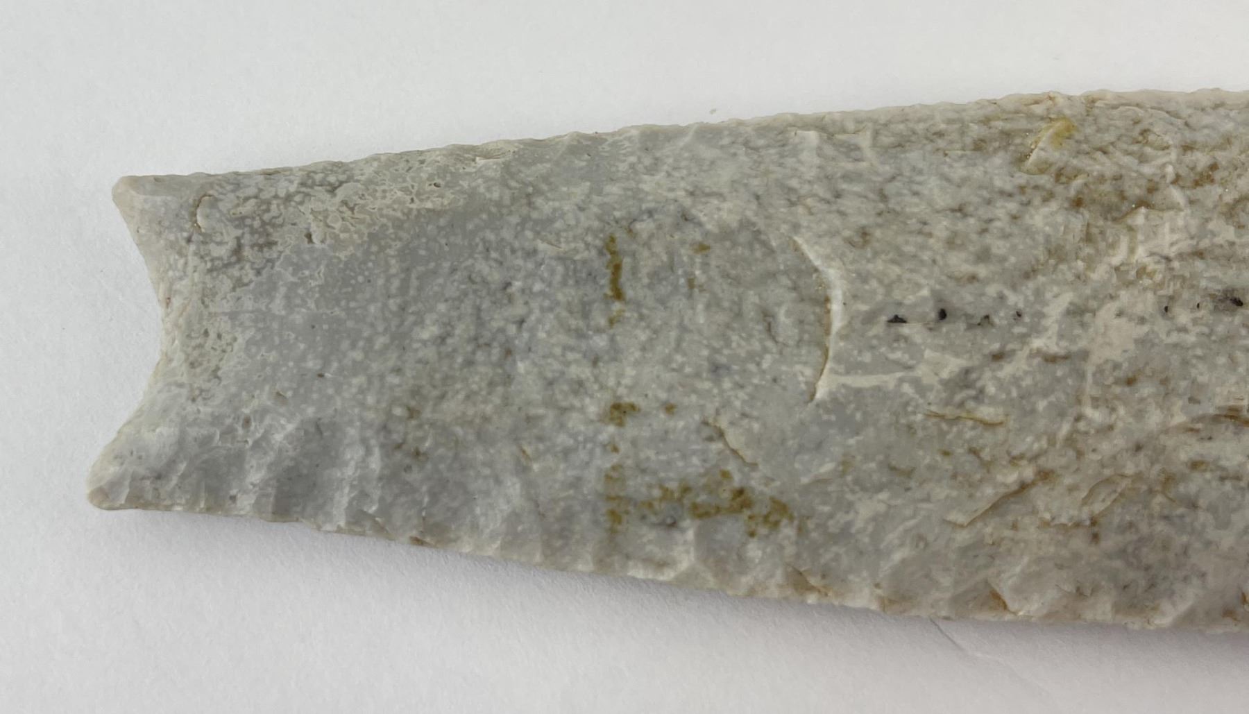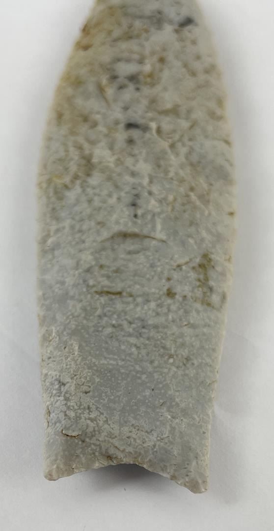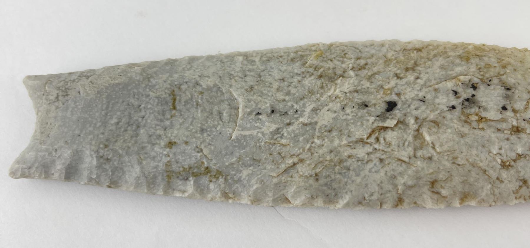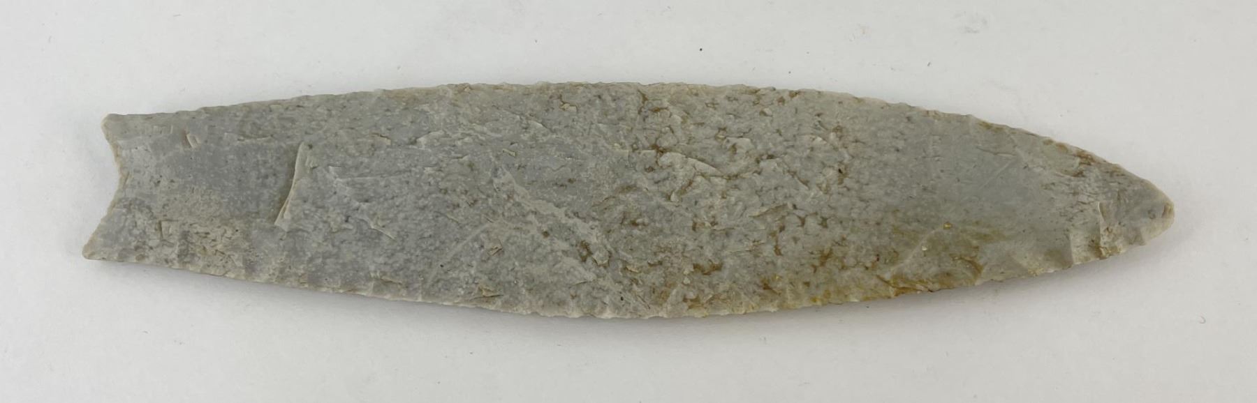 Point has been examined under magnification. It has quite a bit of patina in the grooves and folds of the stone. It appears to be authentic and old. It has some glue residue from being mounted in a frame. 7 1/8" long. No restoration or repair. Wonderful point. Allard Auction Collection Inv: NO TAG