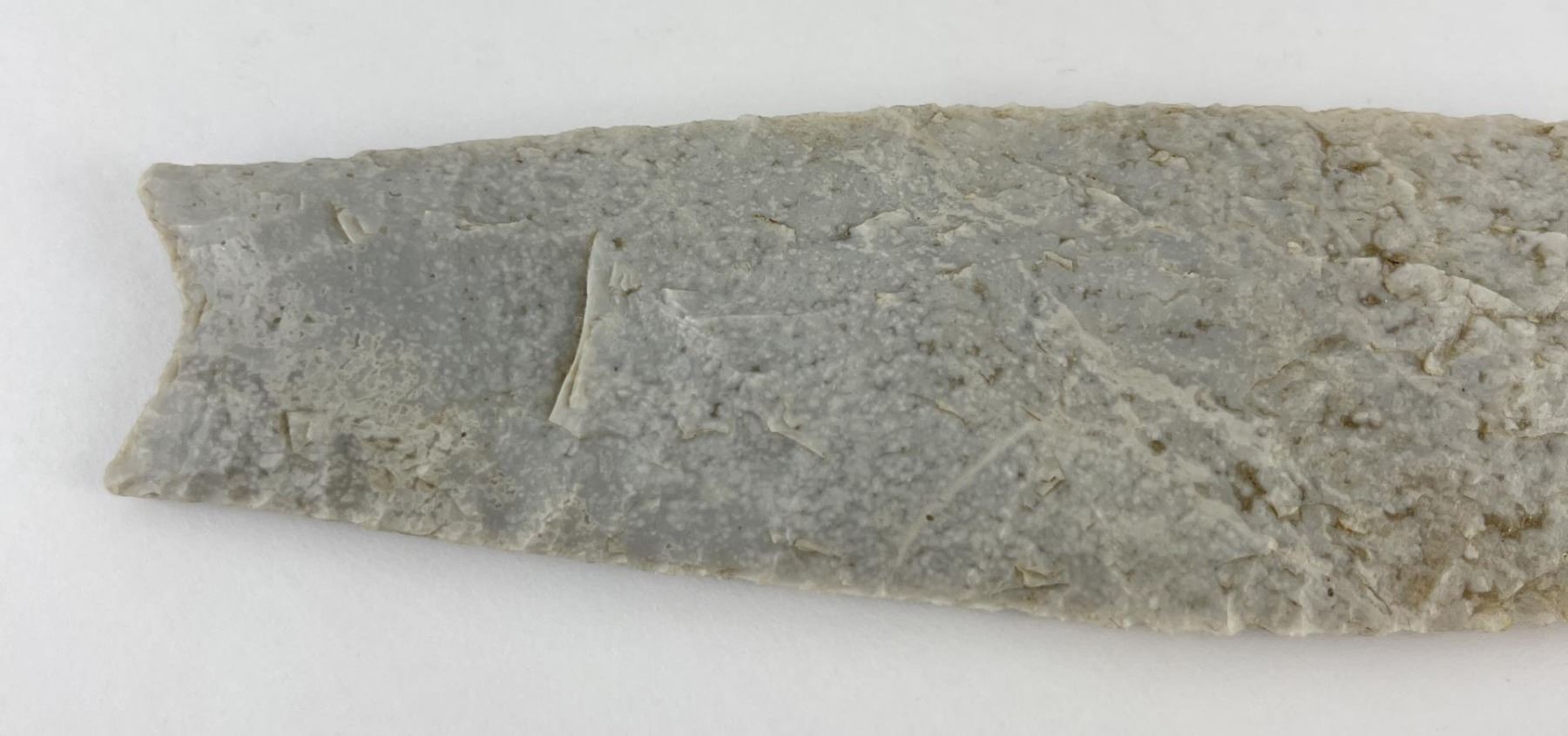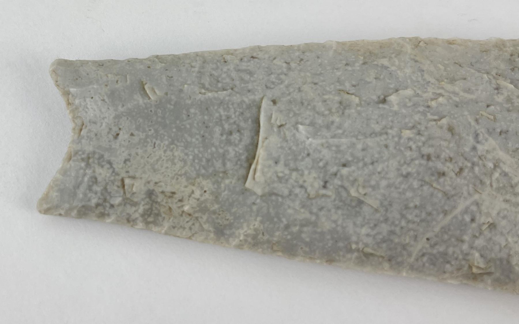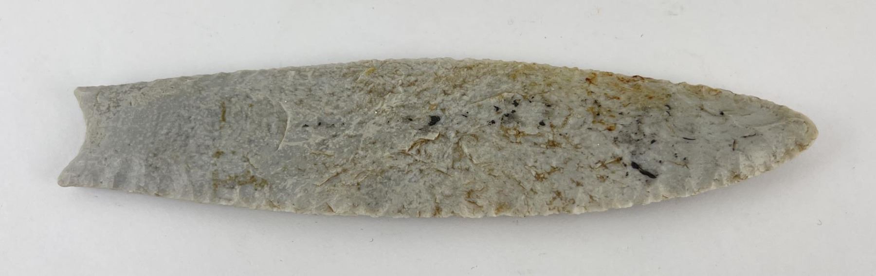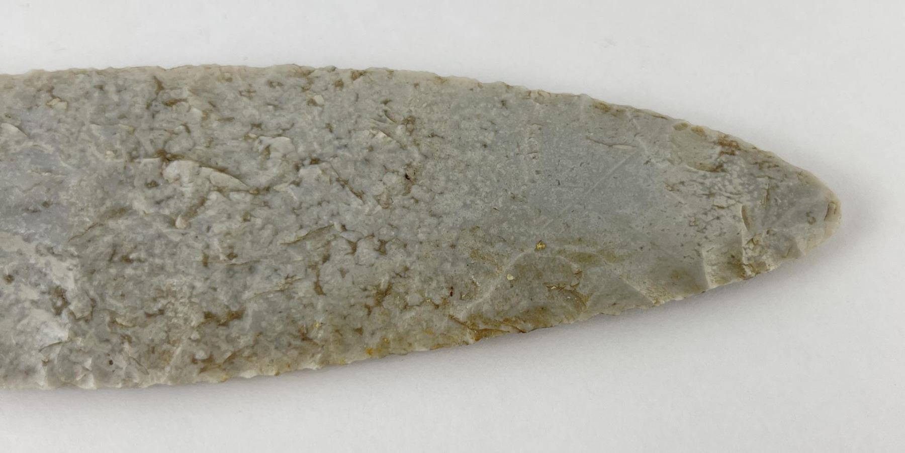 Point has been examined under magnification. It has quite a bit of patina in the grooves and folds of the stone. It appears to be authentic and old. It has some glue residue from being mounted in a frame. 7 1/8" long. No restoration or repair. Wonderful point. Allard Auction Collection Inv: NO TAG