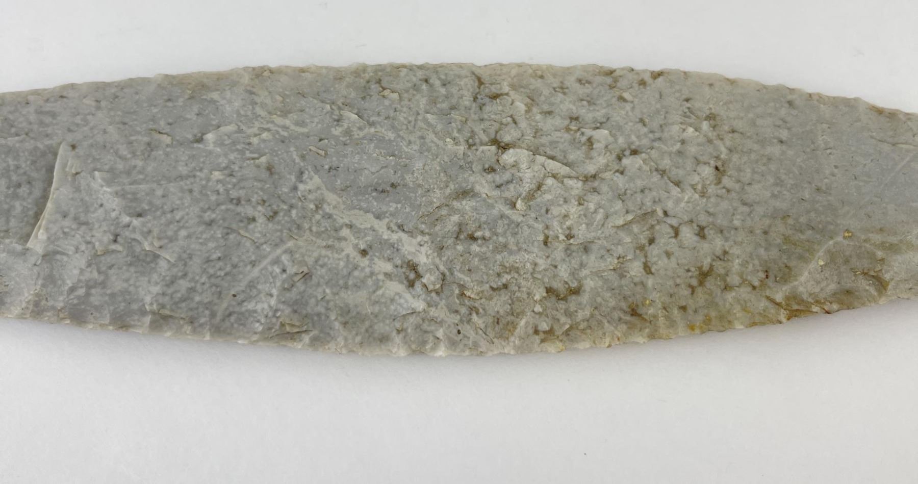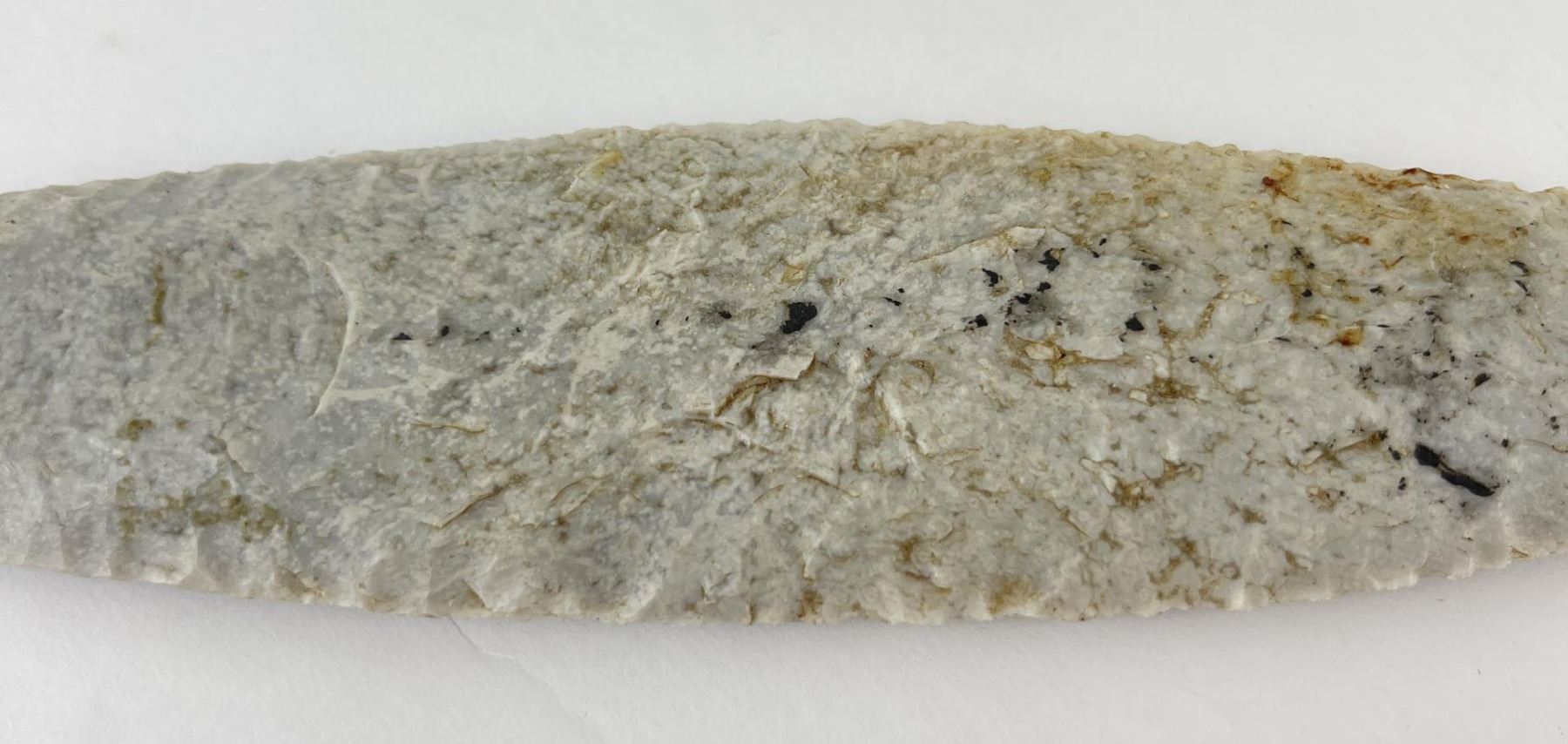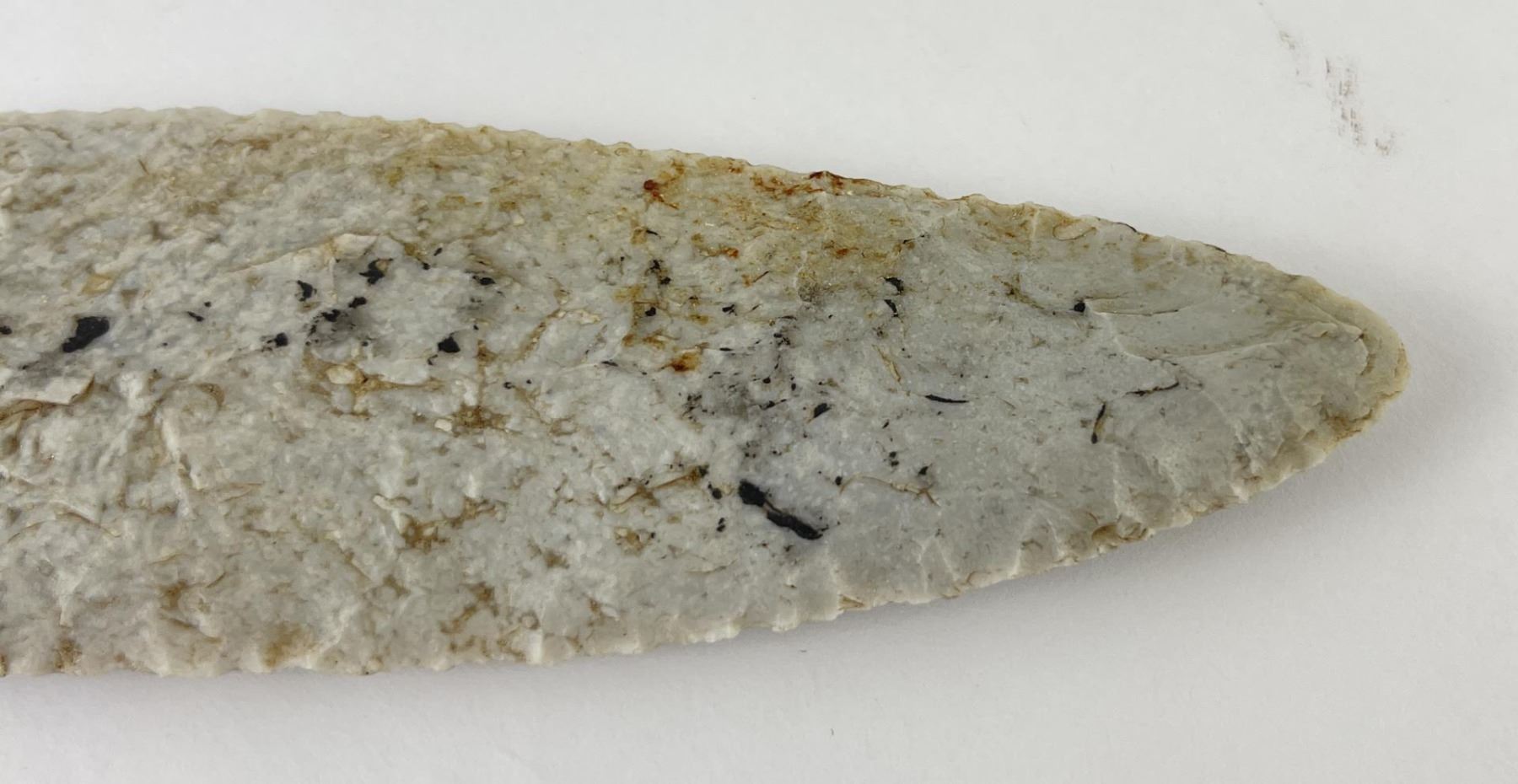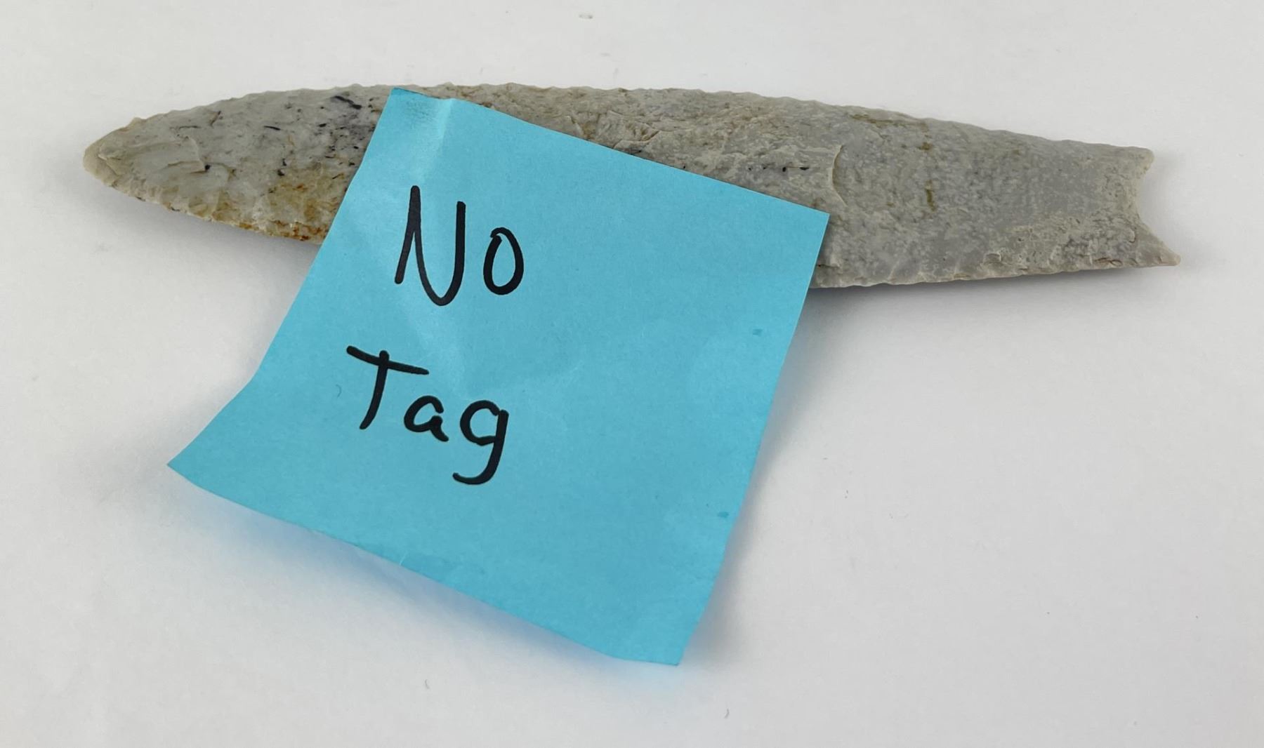 Point has been examined under magnification. It has quite a bit of patina in the grooves and folds of the stone. It appears to be authentic and old. It has some glue residue from being mounted in a frame. 7 1/8" long. No restoration or repair. Wonderful point. Allard Auction Collection Inv: NO TAG