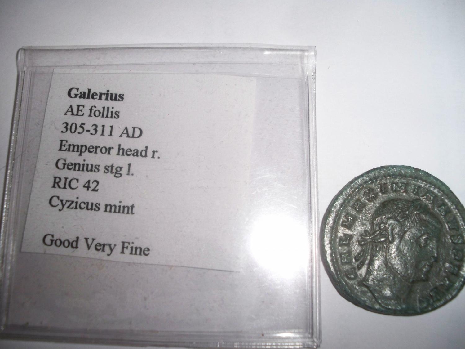 Ancient Coin - Galerius AE follis 305-311 AD. Emperor head r. Genius stg 1. RIC 42. Cyzicus mint. Good/Very Fine.
