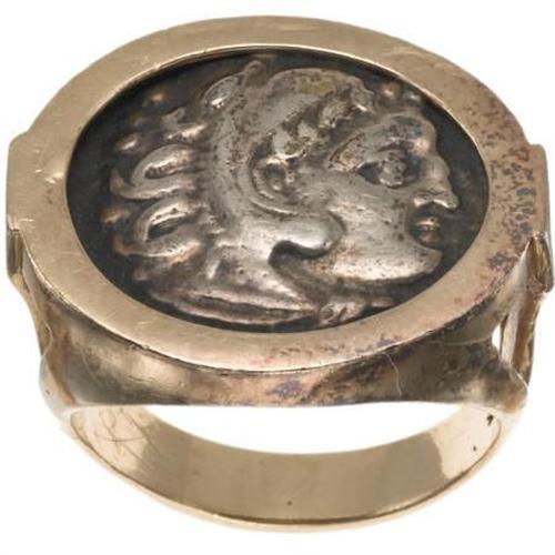 <B>Ancient Coin, Gold Ring</B></I><BR><BR>The ring features an Ancient coin, bezel set in 14k yellow gold. Gross weight 9.30 grams. <BR>*Note: Size 6 (sizeable) <B>Condition Report:</B> Good condition.<BR>Gold needs polishing and buffing.<BR><BR><b>Shipping:</b> Miscellaneous Collectibles, Smal (<a target="_blank" href="http://www.heritageauctions.com/common/shipping.php">view shipping information</a>)