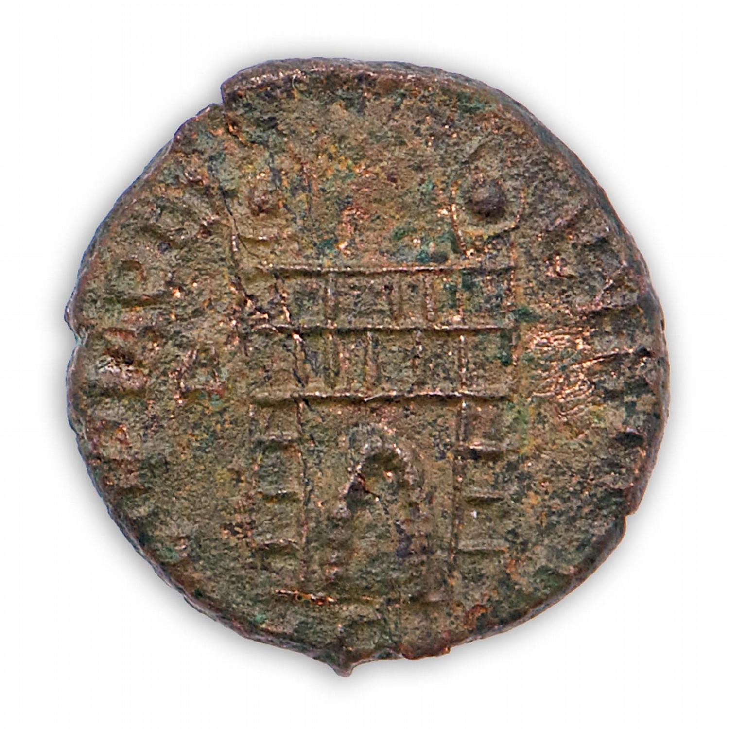 Ancient Coin - Theodosius I AE4. 379-385 AD. DN THEODOSIVS P F AVG, pearl diademed, draped & cuirassed bust right / GLORIA REI-PVBLICE, camp gate, 2 turrets, 5 layers, star above, no doors, B in left field, mintmark TES om ex. #RIC 62b, 10mm. NICE!