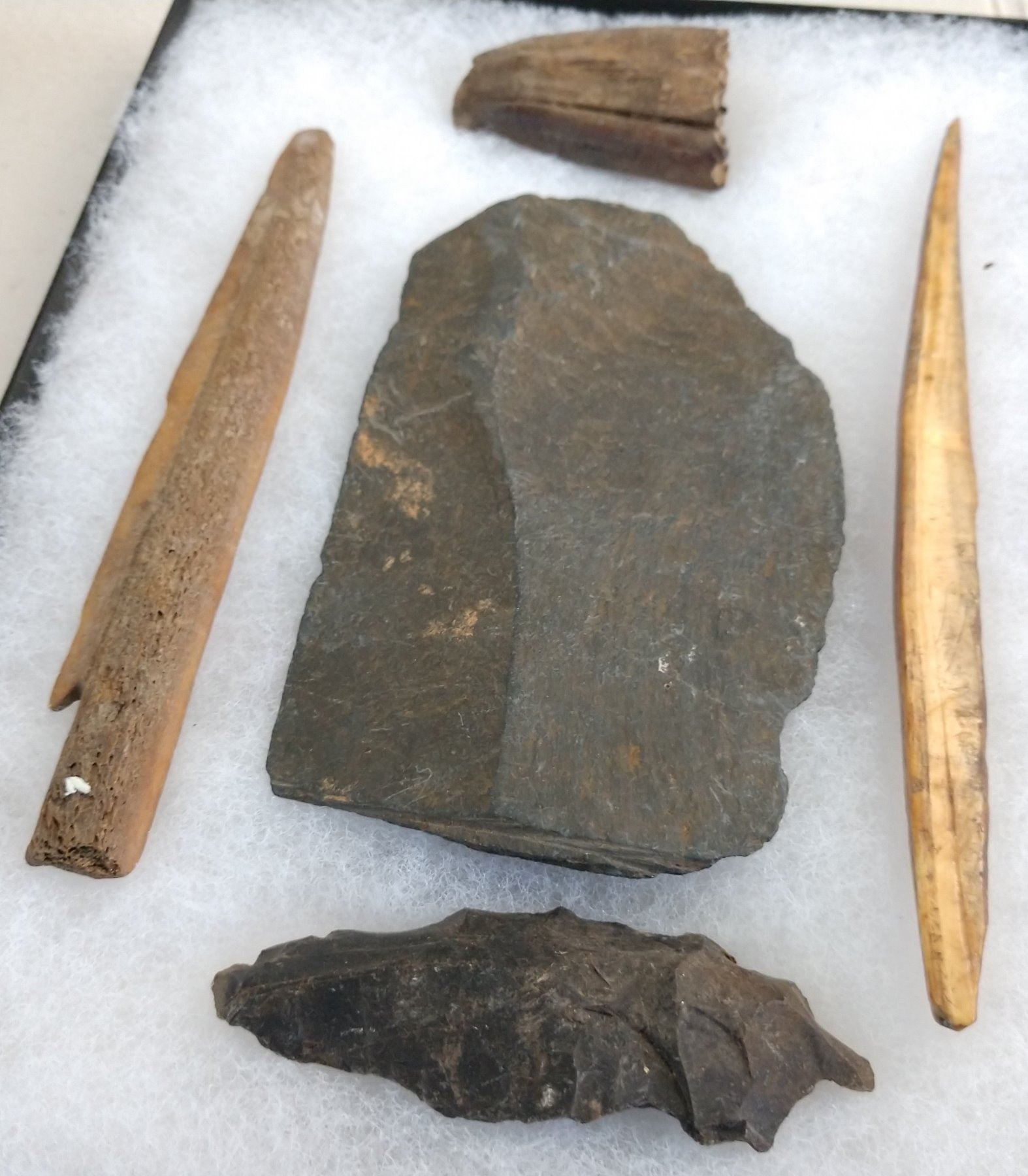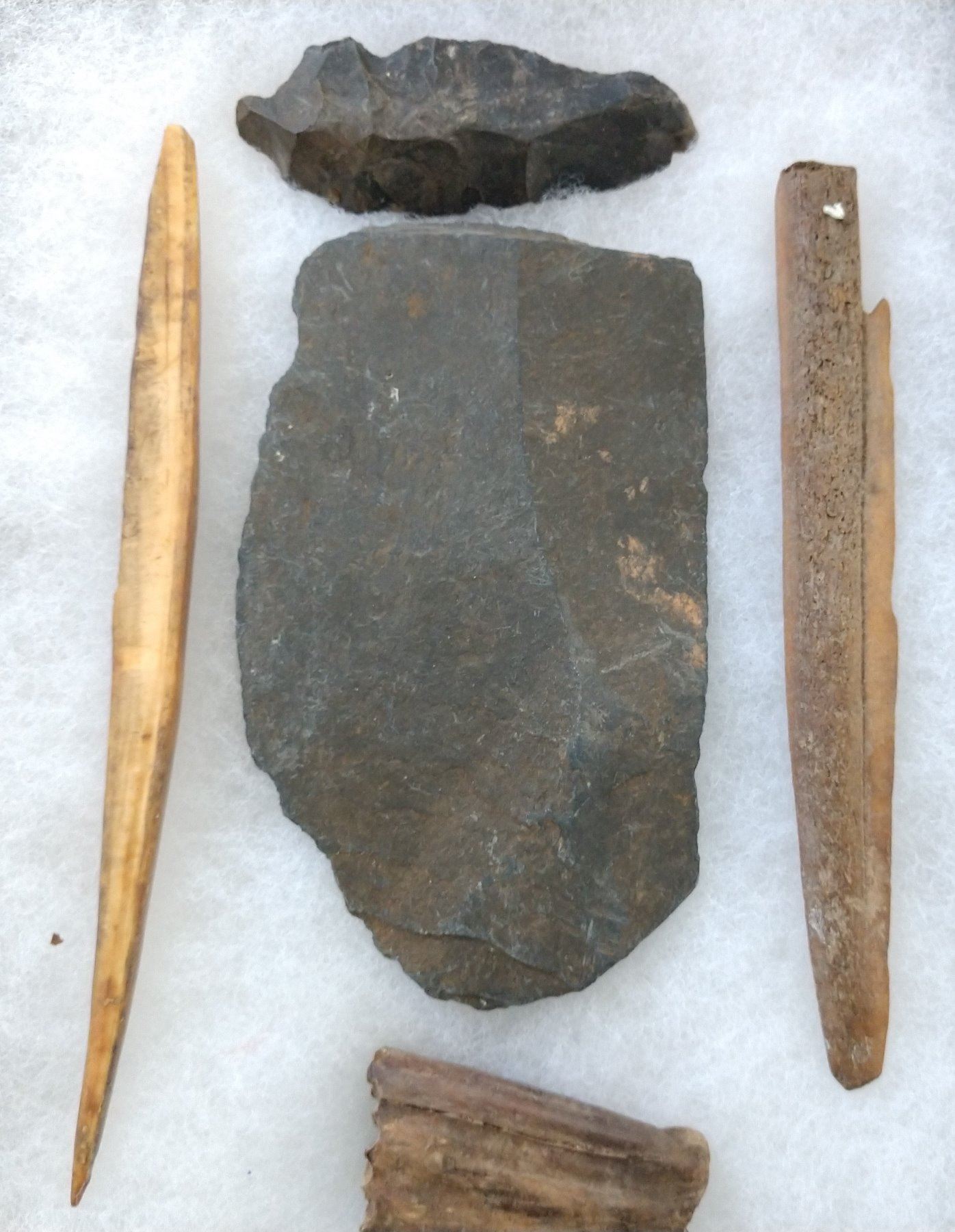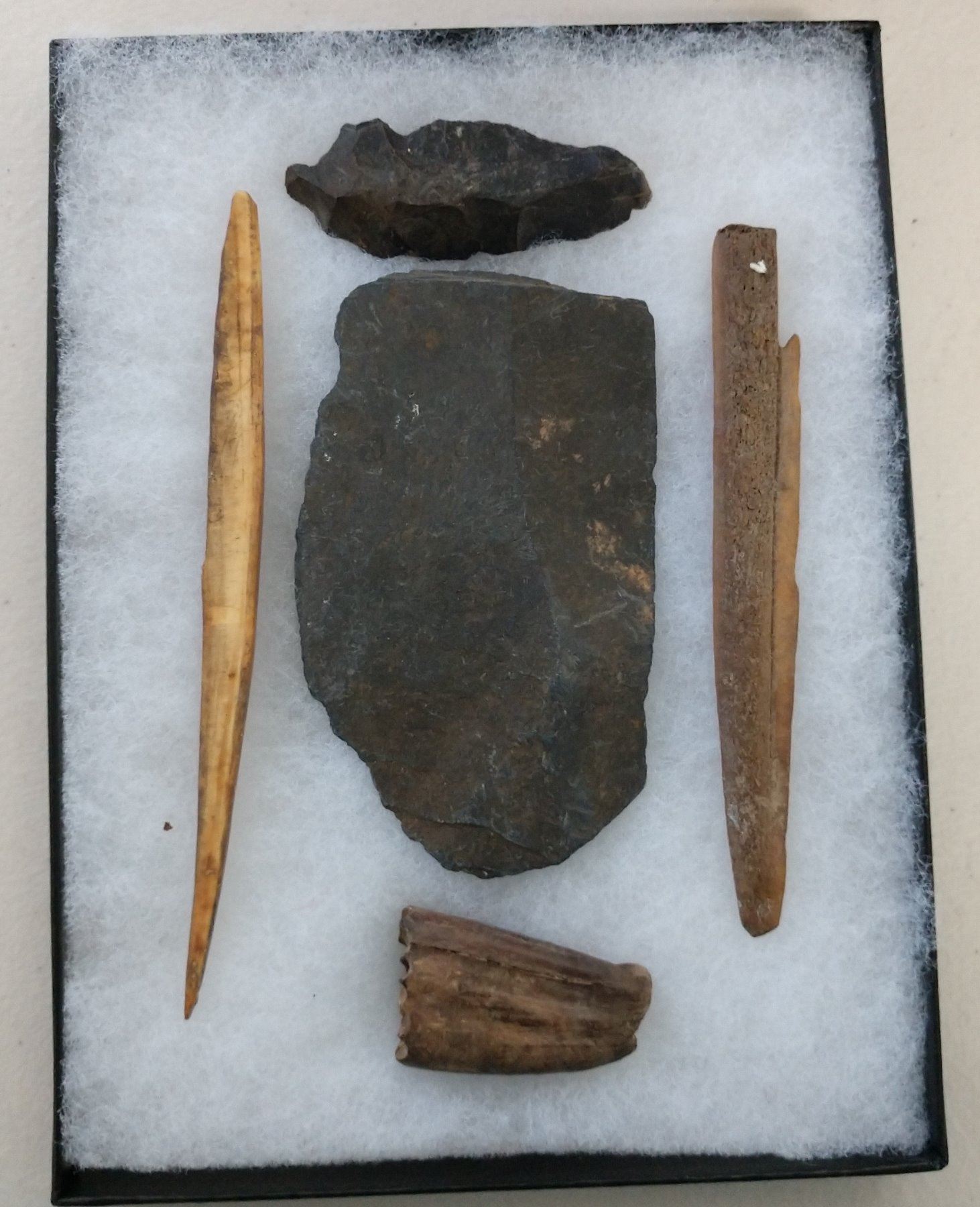 Ancient Eskimo Artifacts, pre-historic items. Made of flint, slate and bone, the items measure 5 3/4" and shorter. Point Barrow, Alaska. Frame not included. Condition: As found, see images. Shipping: $22.50 w/insurance and signature.