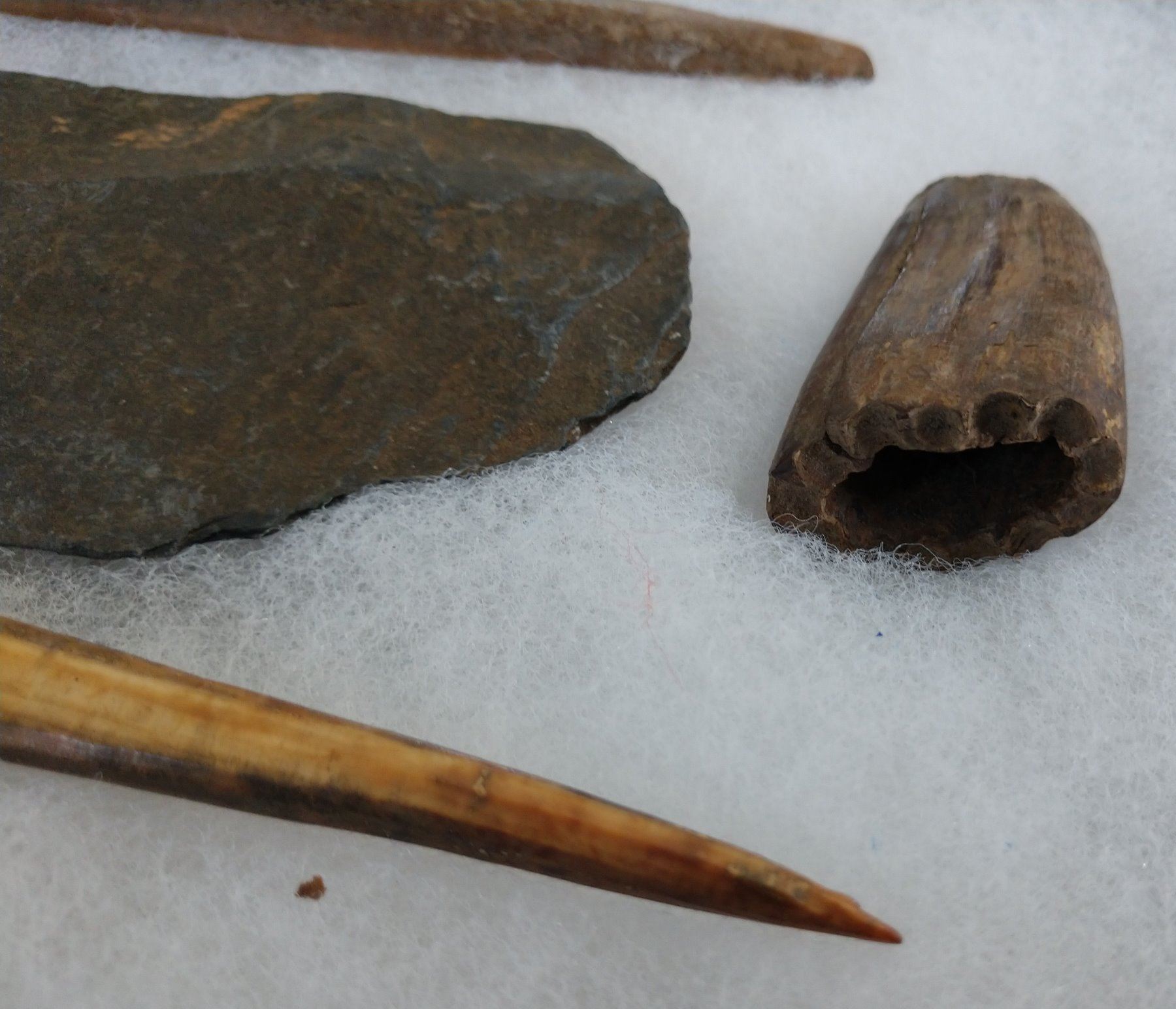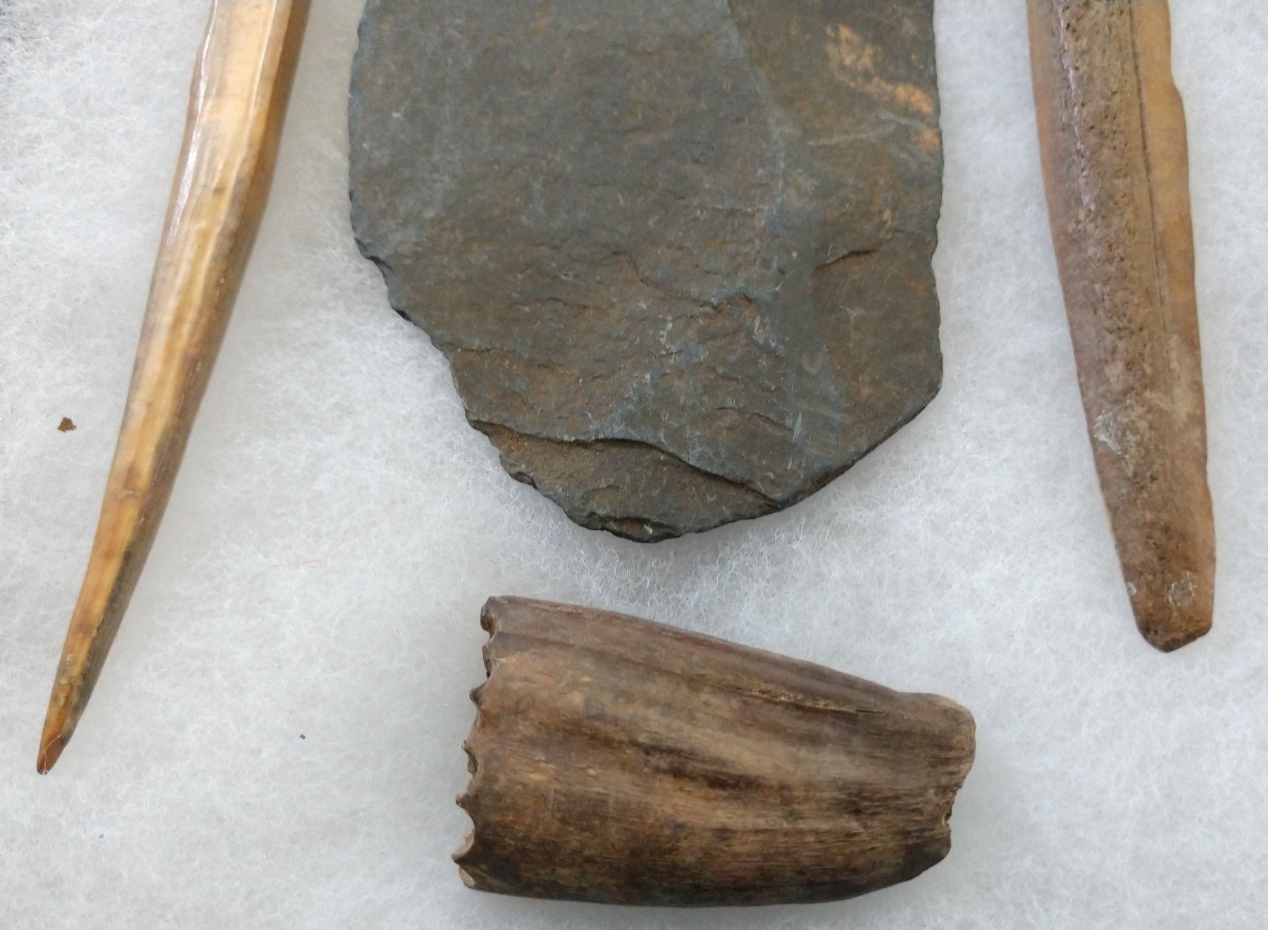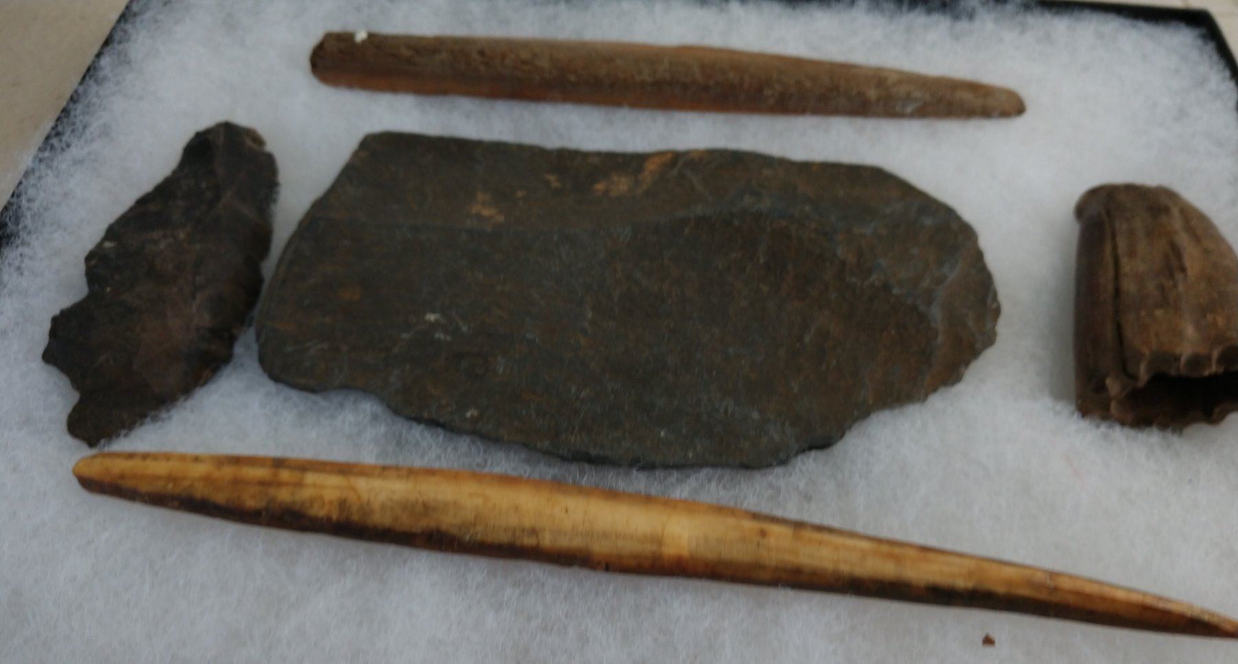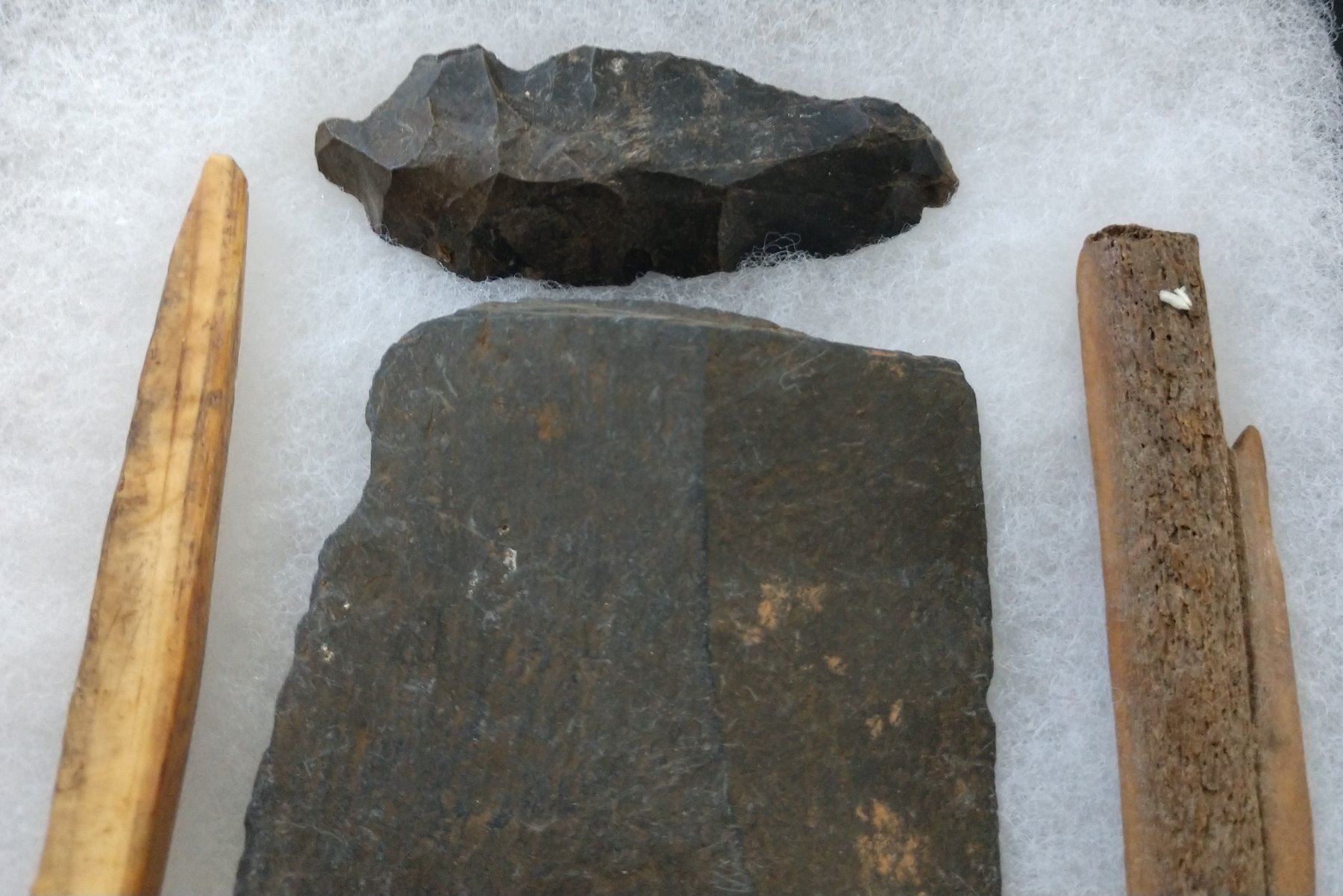 Ancient Eskimo Artifacts, pre-historic items. Made of flint, slate and bone, the items measure 5 3/4" and shorter. Point Barrow, Alaska. Frame not included. Condition: As found, see images. Shipping: $22.50 w/insurance and signature.