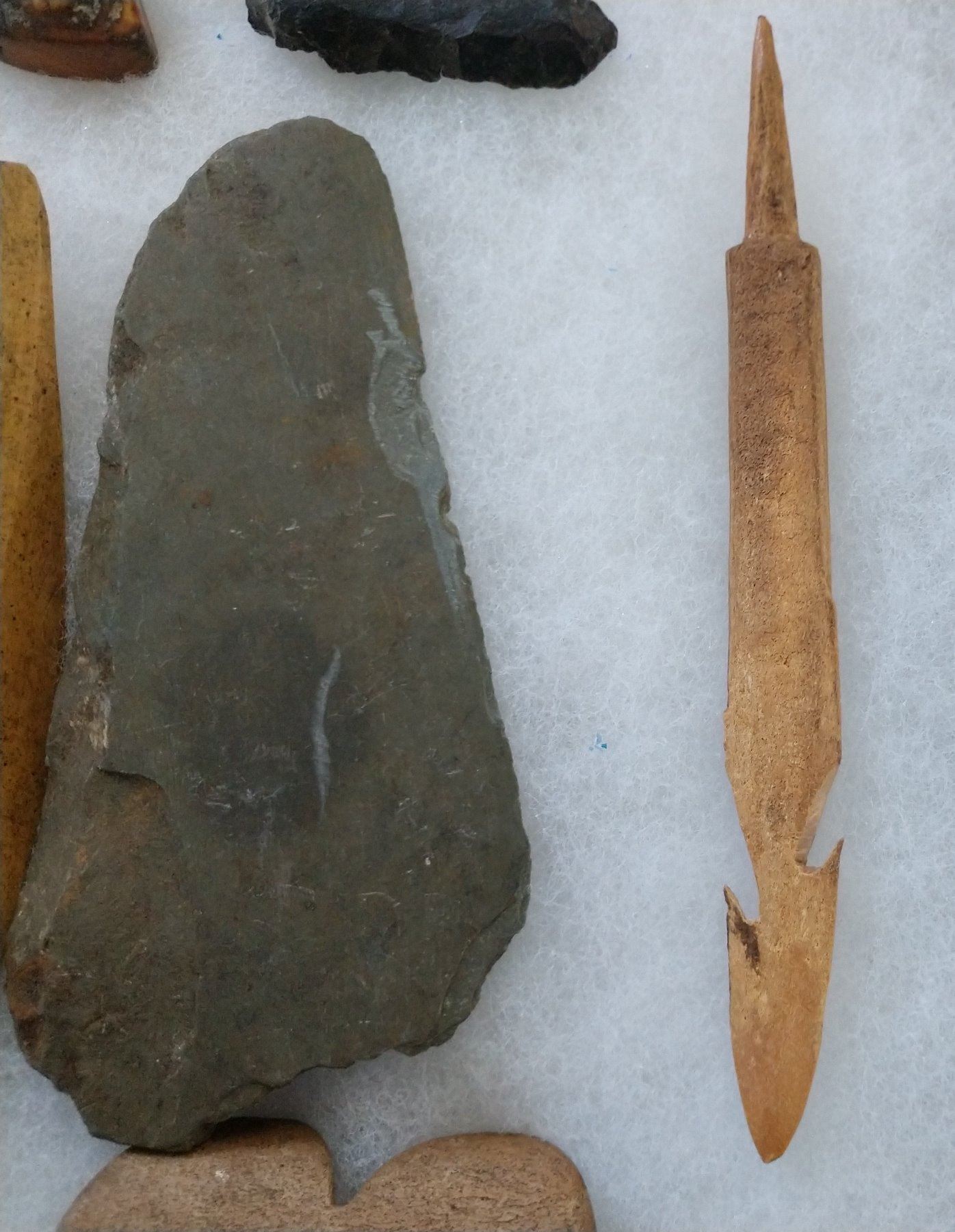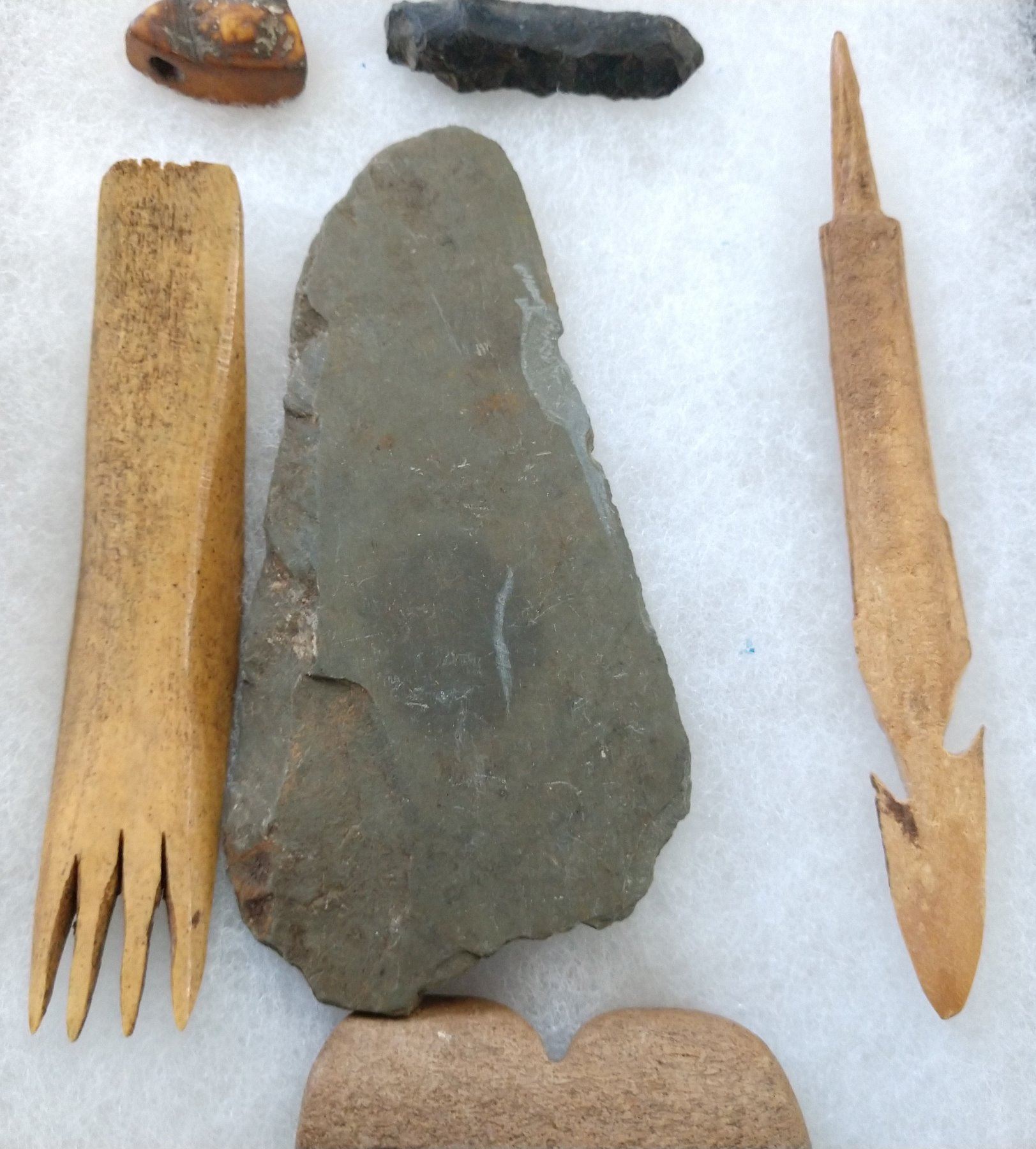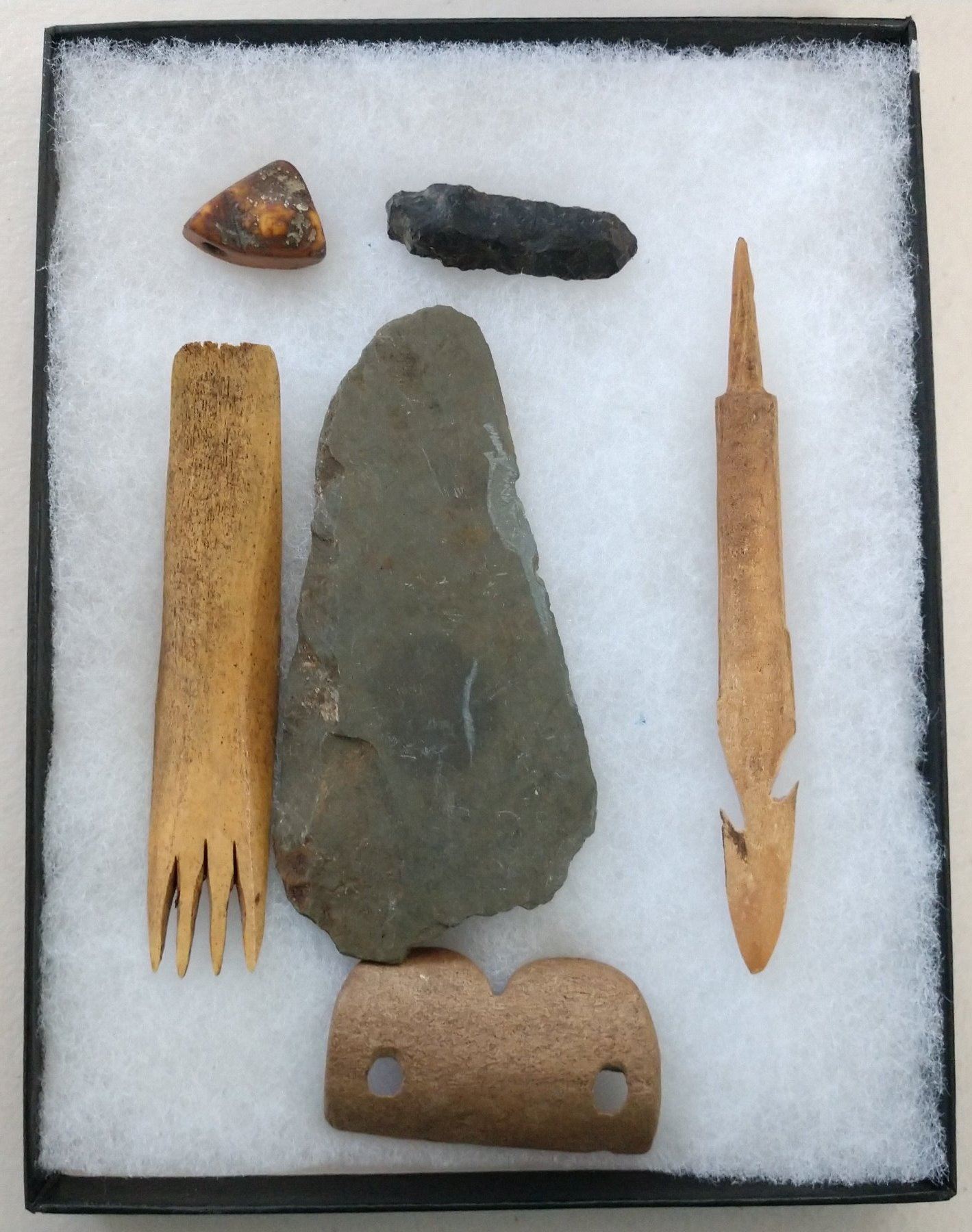 Ancient Eskimo Artifacts, pre-historic items. Made of flint, slate and bone, the items measure 5" and shorter. Point Barrow, Alaska. Including bone comb. Frame not included. Condition: As found, see images. Shipping: $22.50 w/insurance and signature.