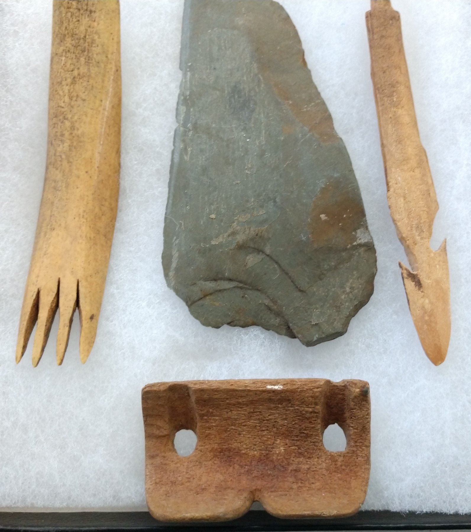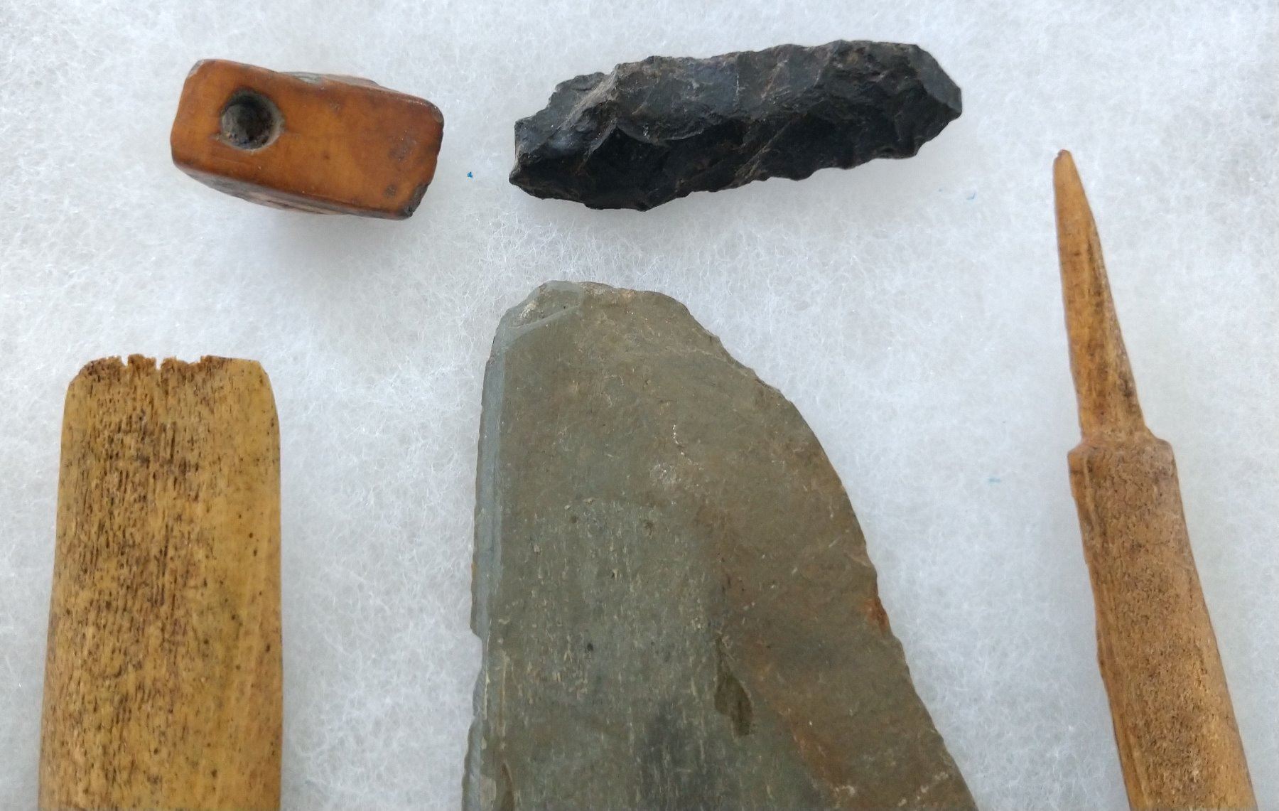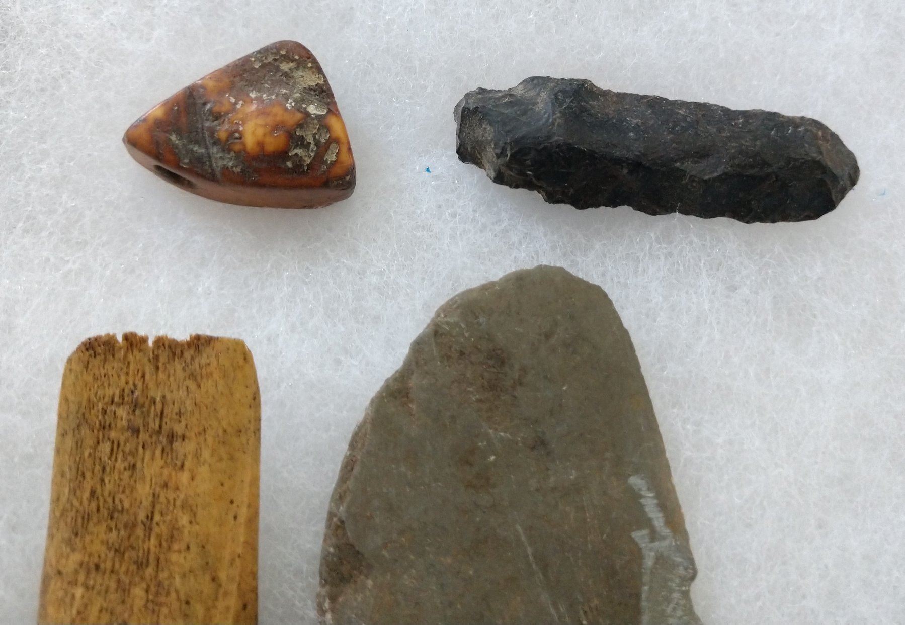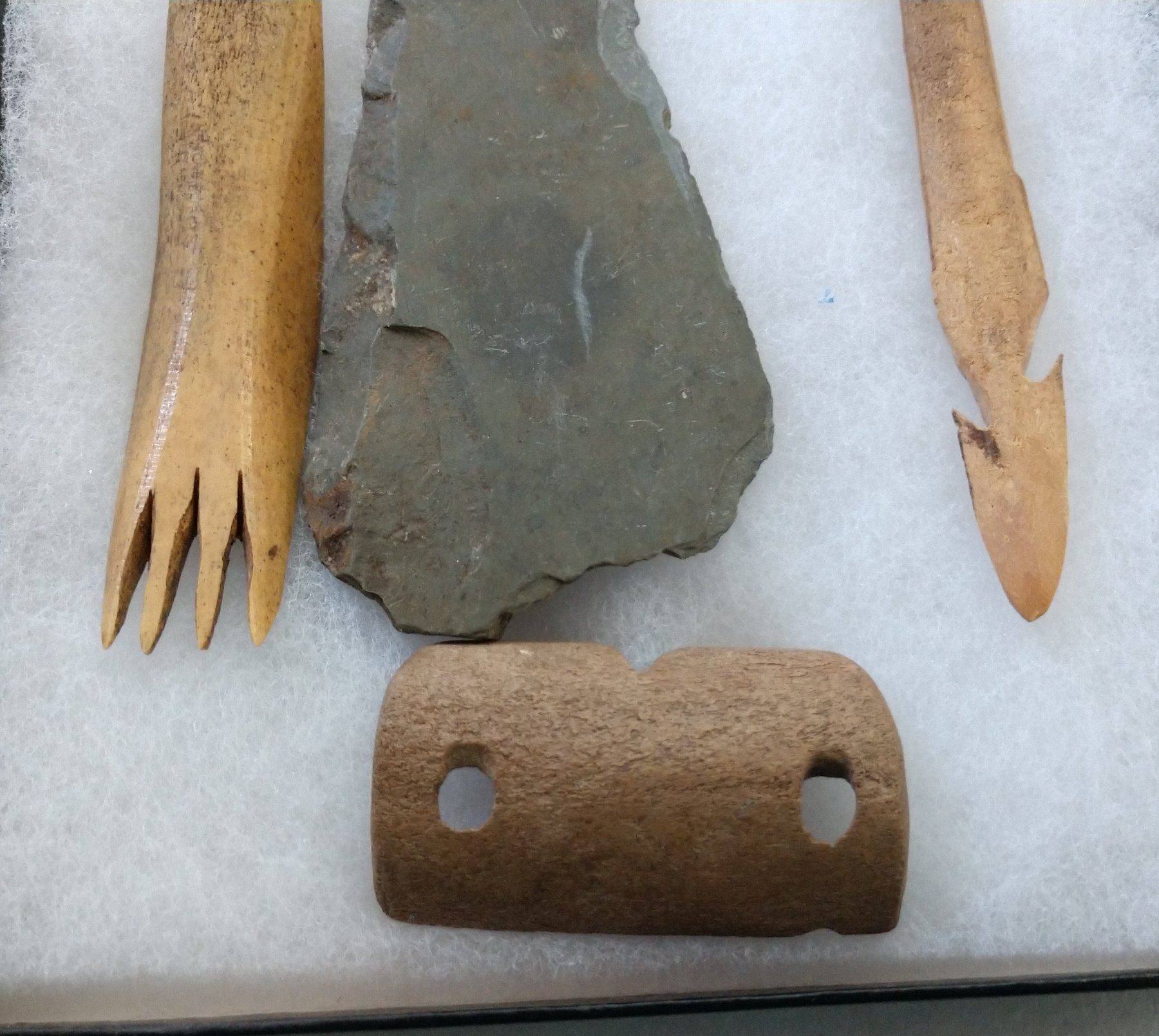 Ancient Eskimo Artifacts, pre-historic items. Made of flint, slate and bone, the items measure 5" and shorter. Point Barrow, Alaska. Including bone comb. Frame not included. Condition: As found, see images. Shipping: $22.50 w/insurance and signature.