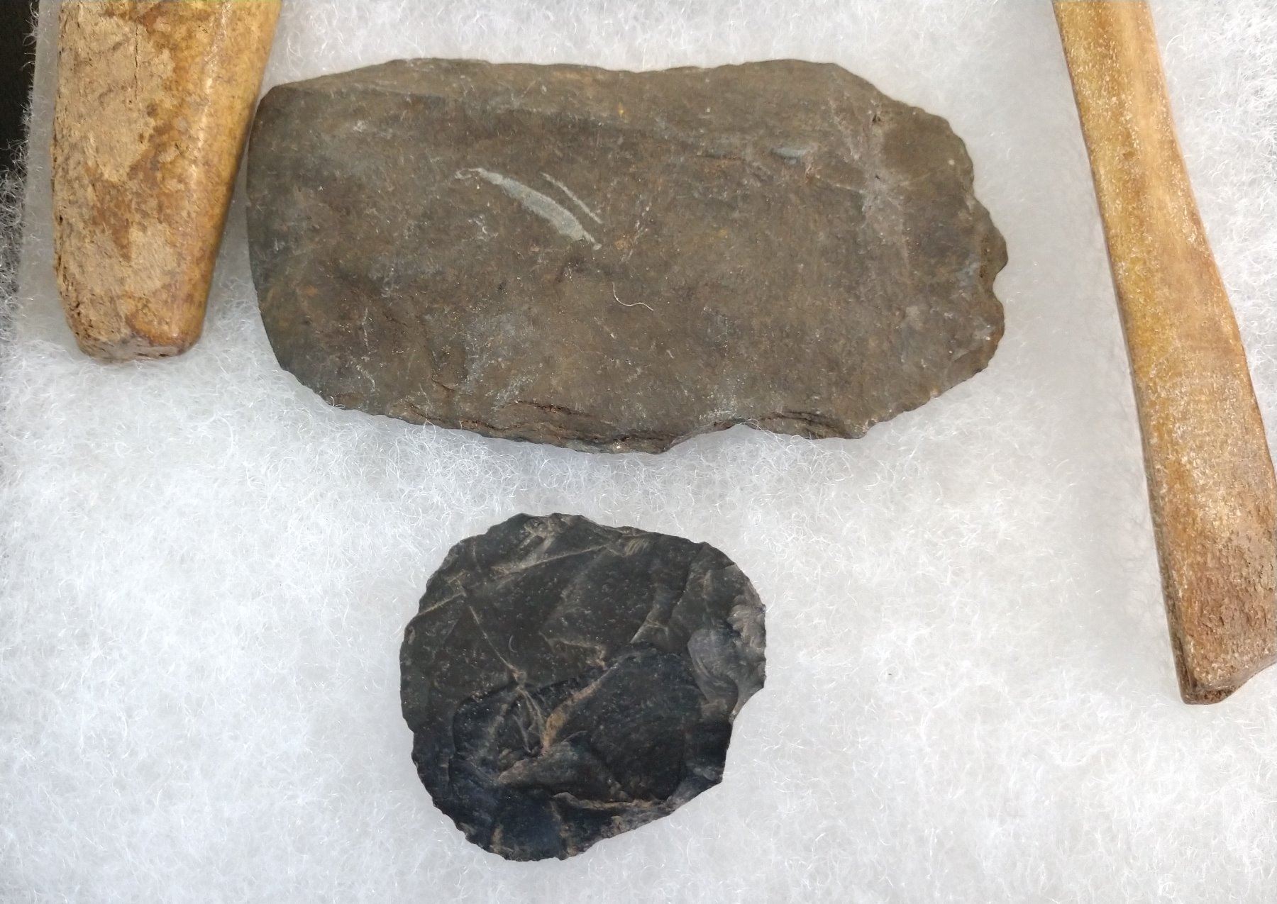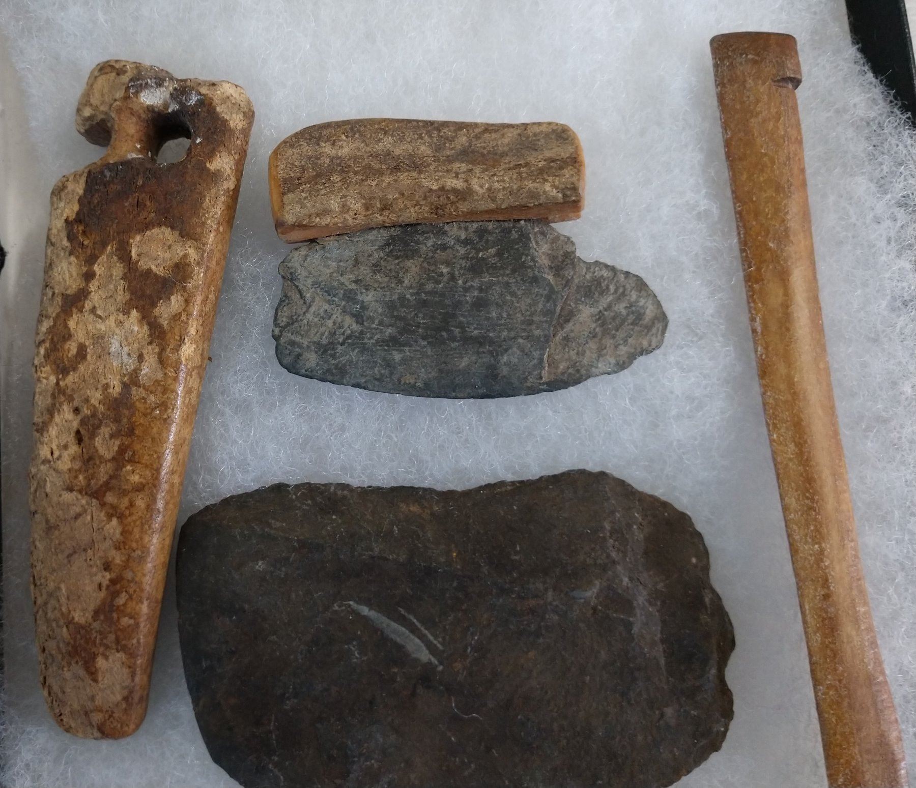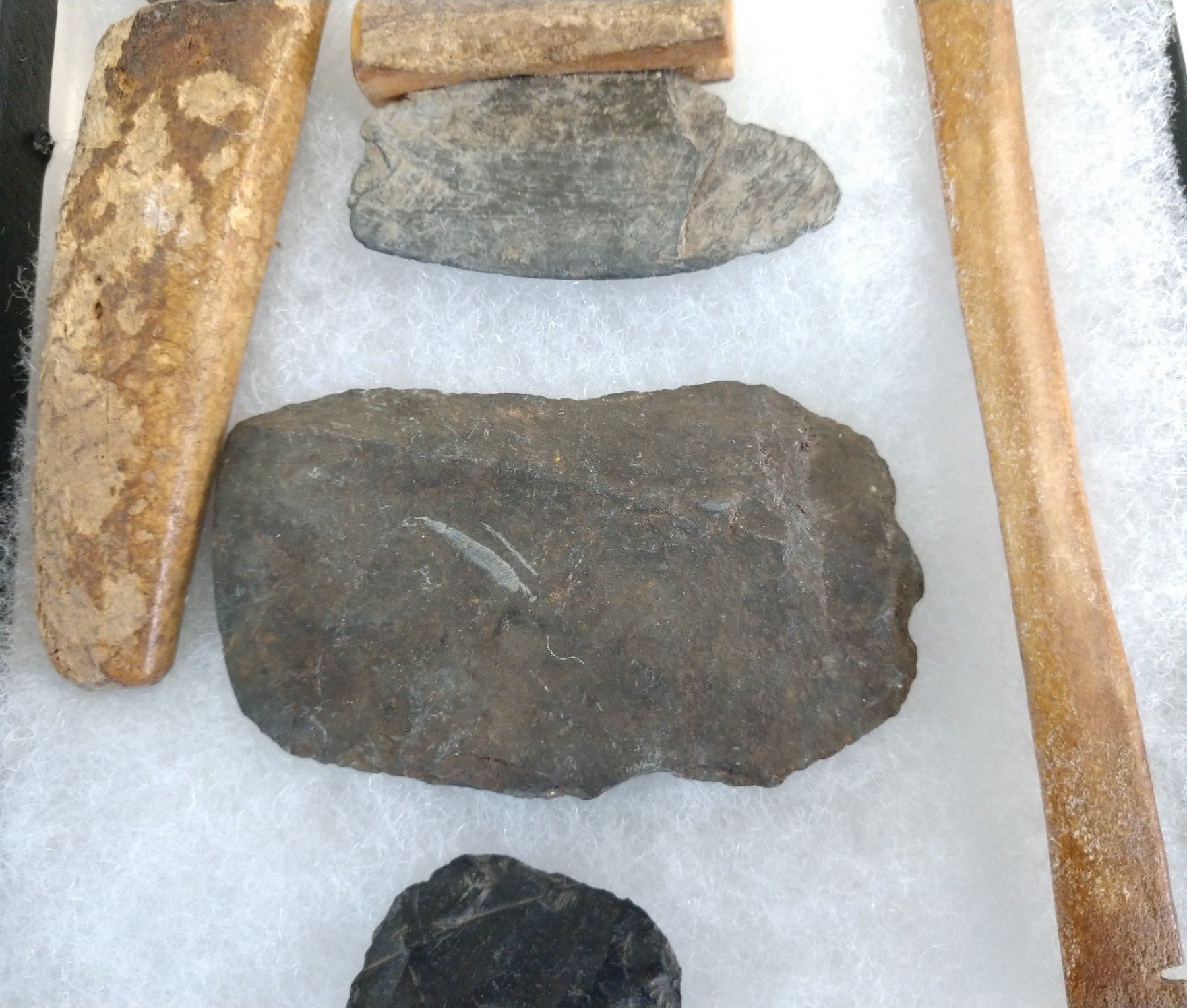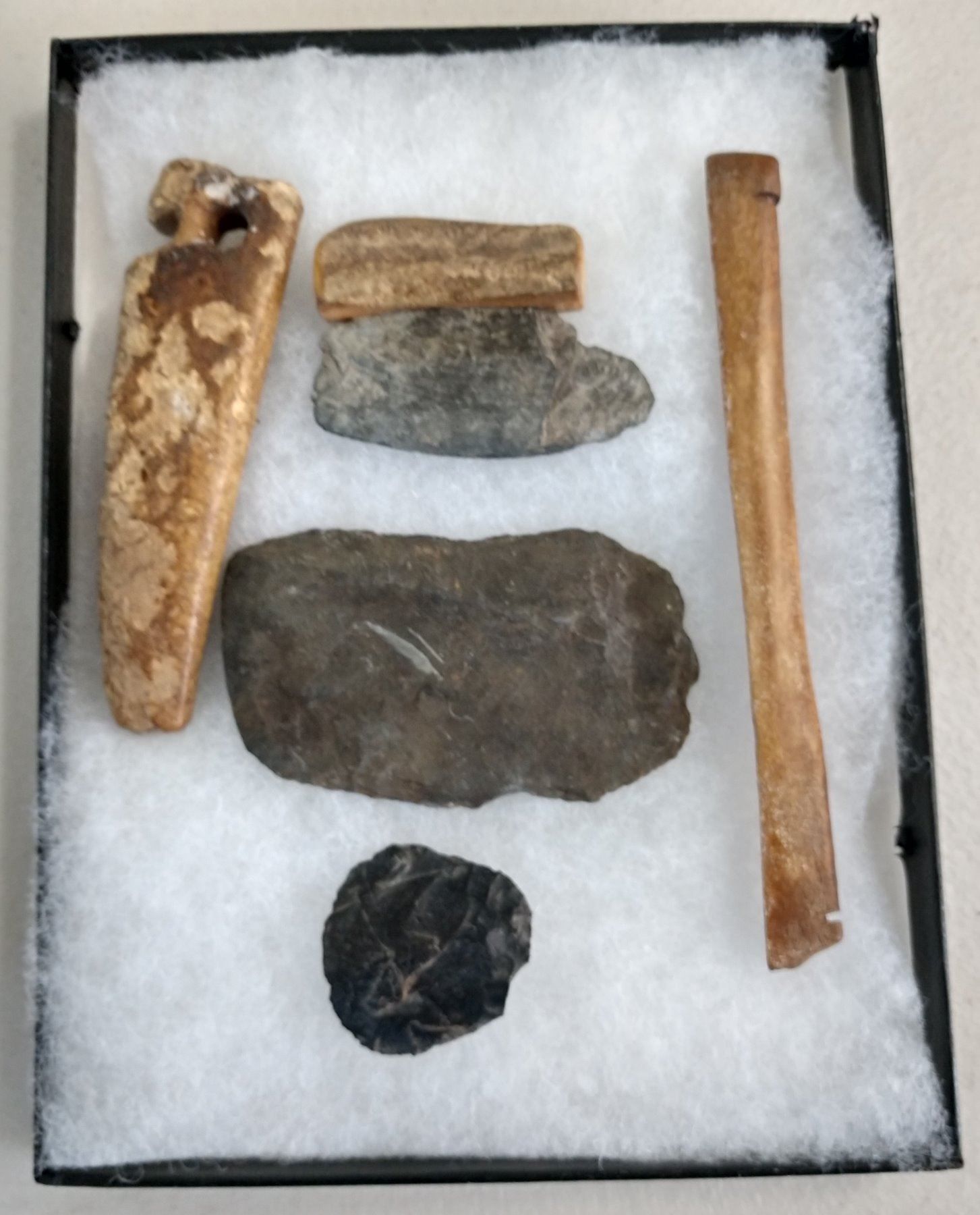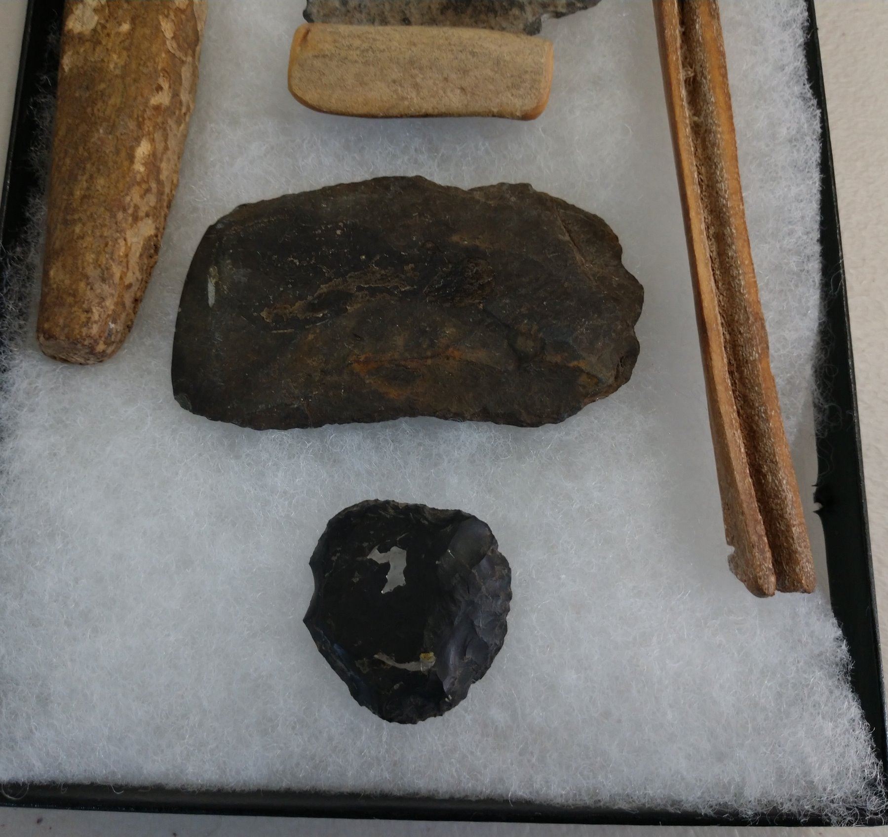 Ancient Eskimo Artifacts, pre-historic items. Made of flint, slate and bone, the items measure 5 3/4" and shorter. Point Barrow, Alaska. Including ulu knife. Frame not included. Condition: As found, see images. Shipping: $22.50 w/insurance and signature.