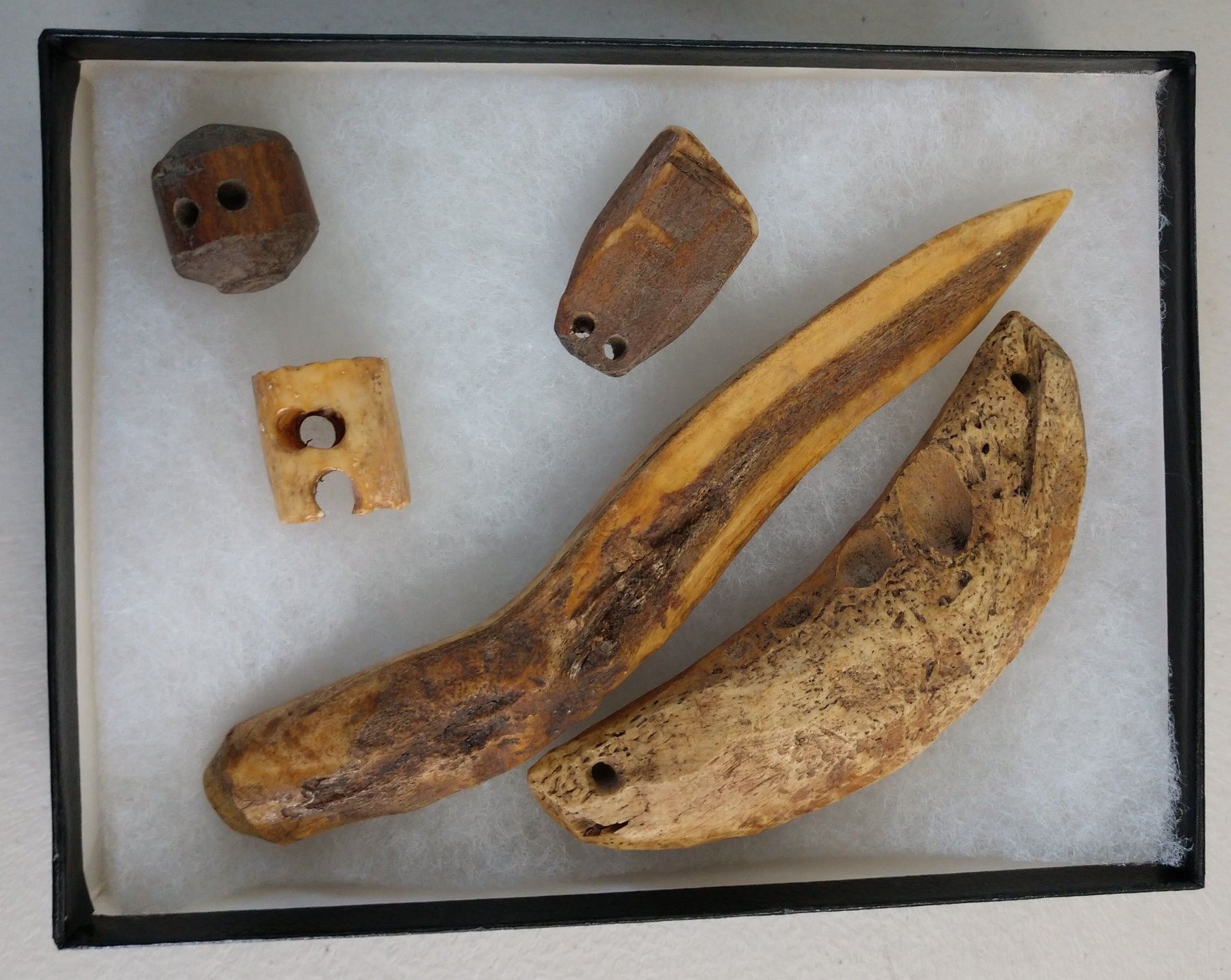 Ancient Eskimo Artifacts, pre-historic items. Made of bone, the items measure 7" and shorter. Point Barrow, Alaska. 7" bone dagger is very rare. Frame not included. Condition: As found, see images. Shipping: $22.50 w/insurance and signature.