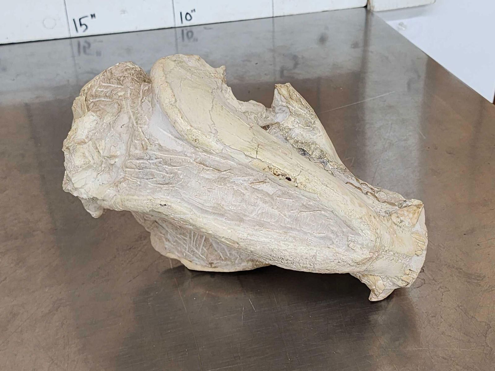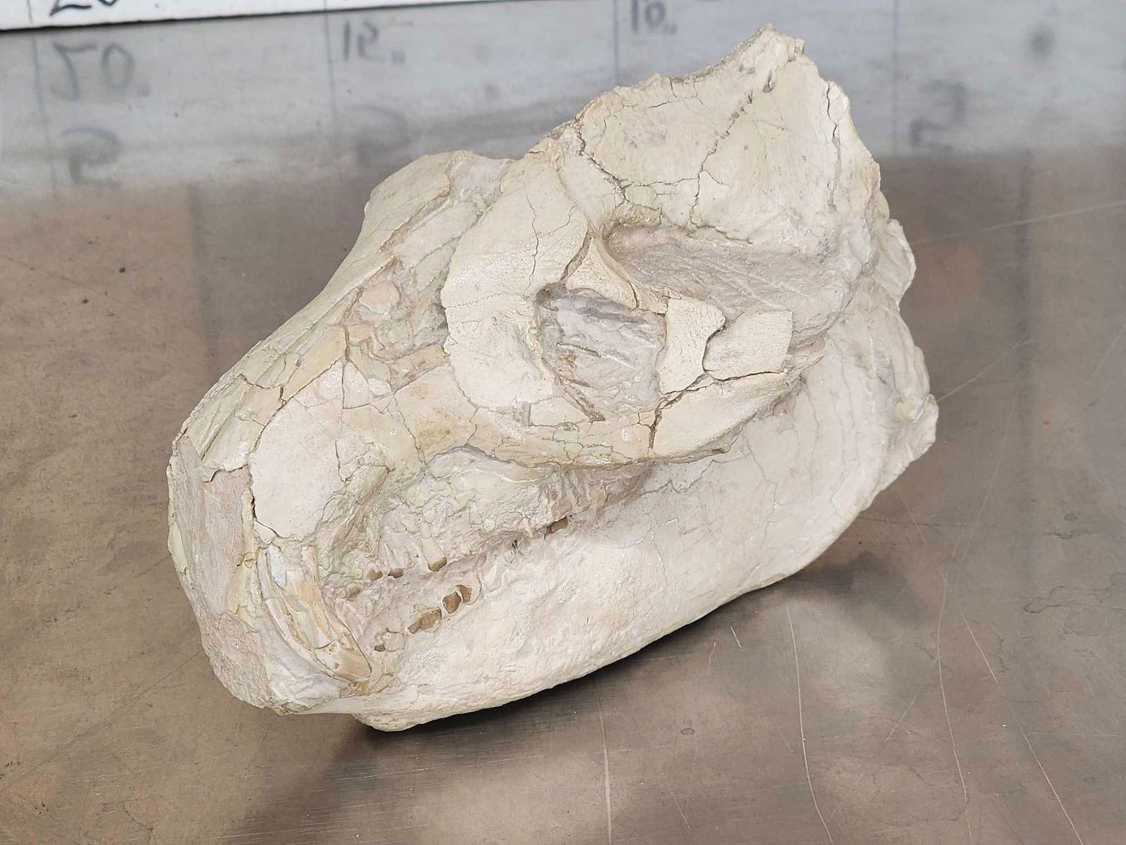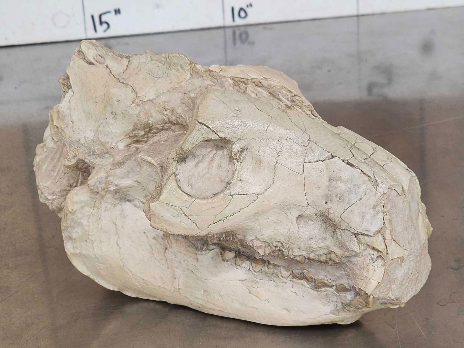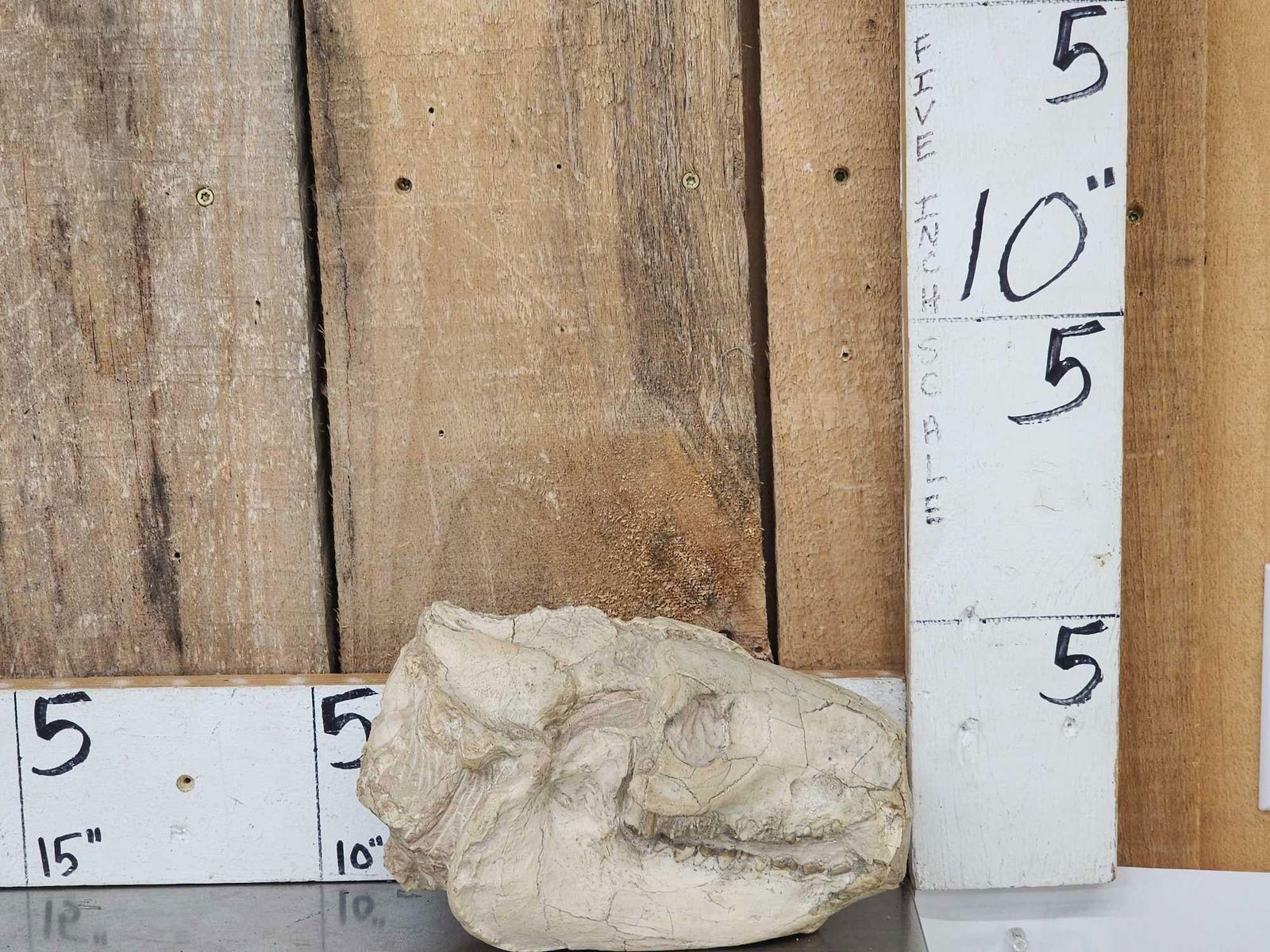 31.35 This is a large specimen with nearly complete bottom jaw visible teeth still in matrix. Some restoration which is common with most fossilized specimens of this nature .This Awesome piece is anywhere from 5 to 20 million years old! Weight 7.3 Lbs