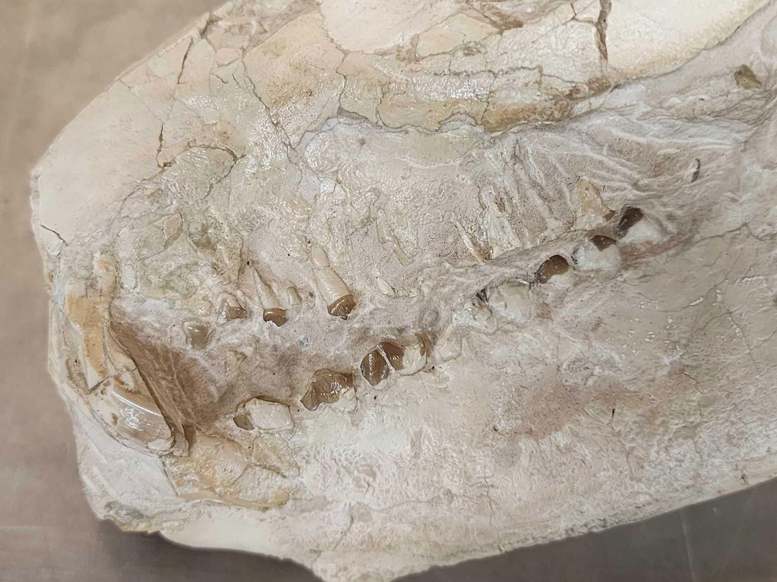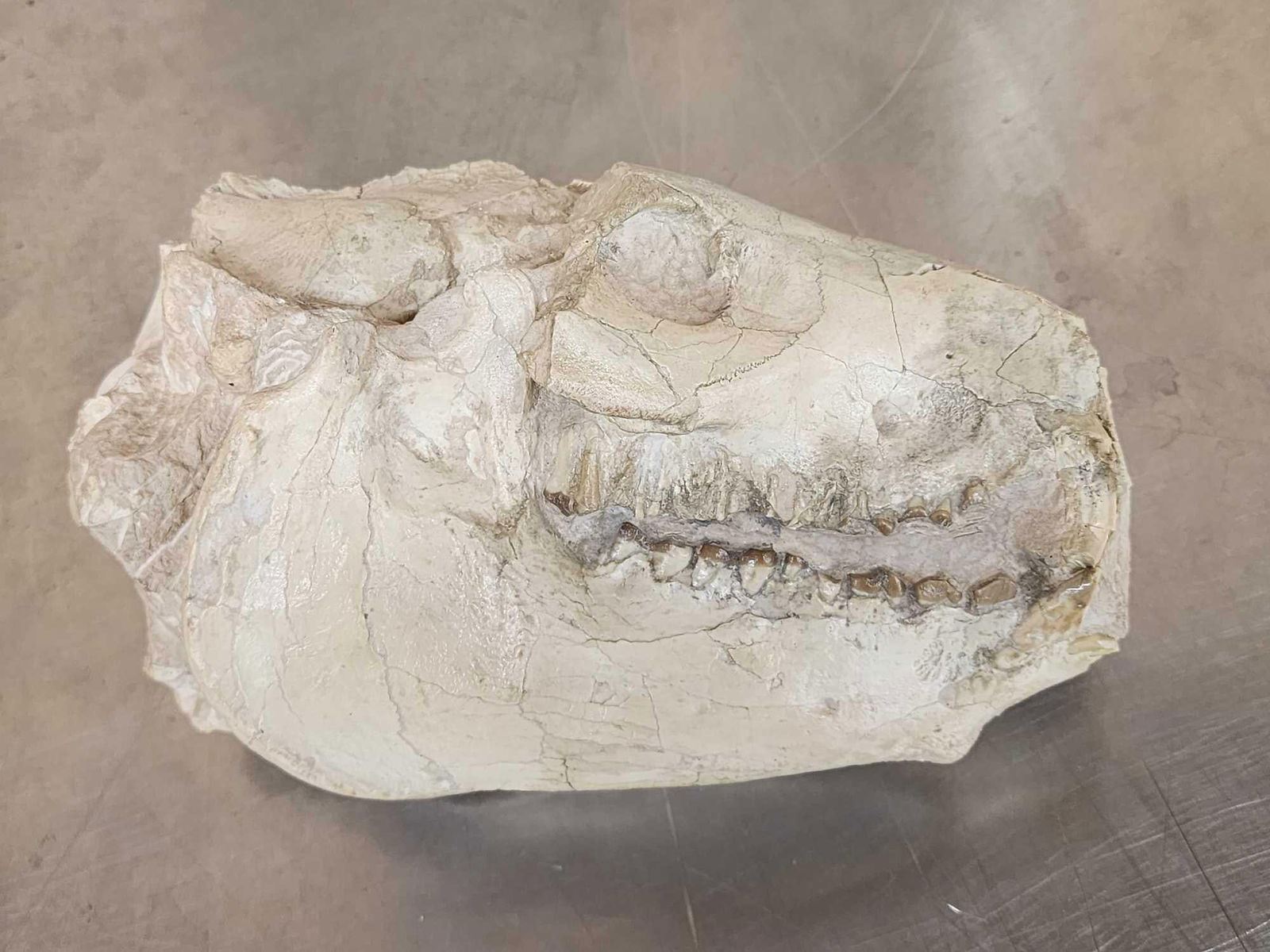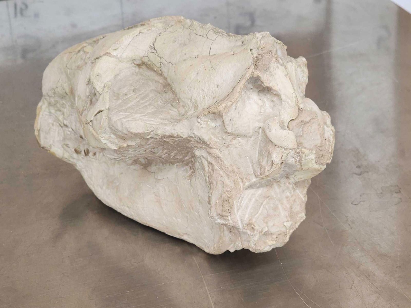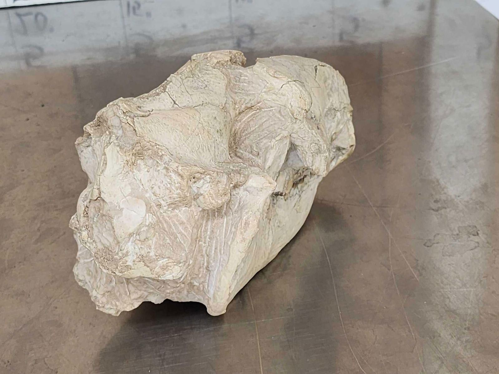 31.35 This is a large specimen with nearly complete bottom jaw visible teeth still in matrix. Some restoration which is common with most fossilized specimens of this nature .This Awesome piece is anywhere from 5 to 20 million years old! Weight 7.3 Lbs
