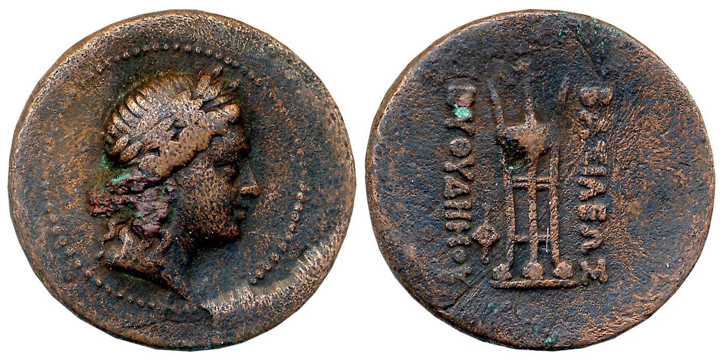 Graeco Bactrians, Euthydemos II, Bronze Double Unit, 11.07g, Obv: Laureate head of Apollo to right, Rev: Tripod, monogram in inner left field, “BAΣIΛEΩΣ” downwards to right, “EYΘYΔHMOY” downwards on left (Hoover# 79). About very fine.