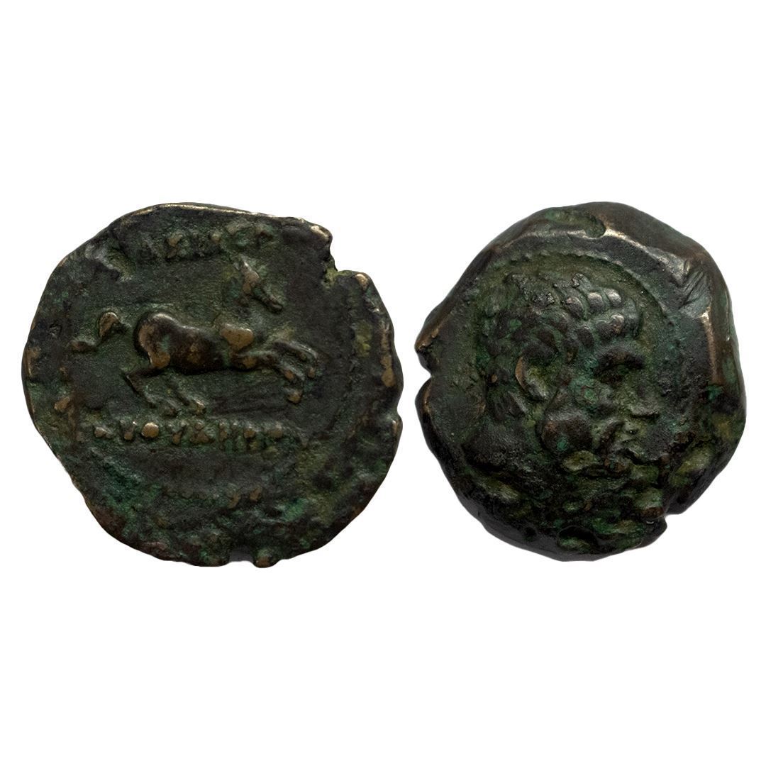 Ancient, Greco Bactrians, Euthydemos I (c. 230-220 BC), Bronze Unit, 7.73 gms, Obverse: Head of Herakles facing to right, a dotted border around, Reverse: A horse prancing to right, Greek legend on upper and lower fields reading ‘BAΣIΛEΩΣ EYΘYΔHMOY’, very fine+, very scarce.