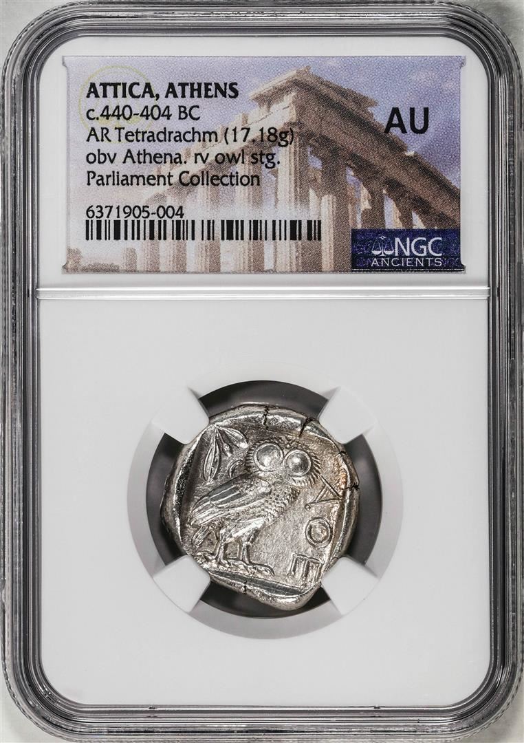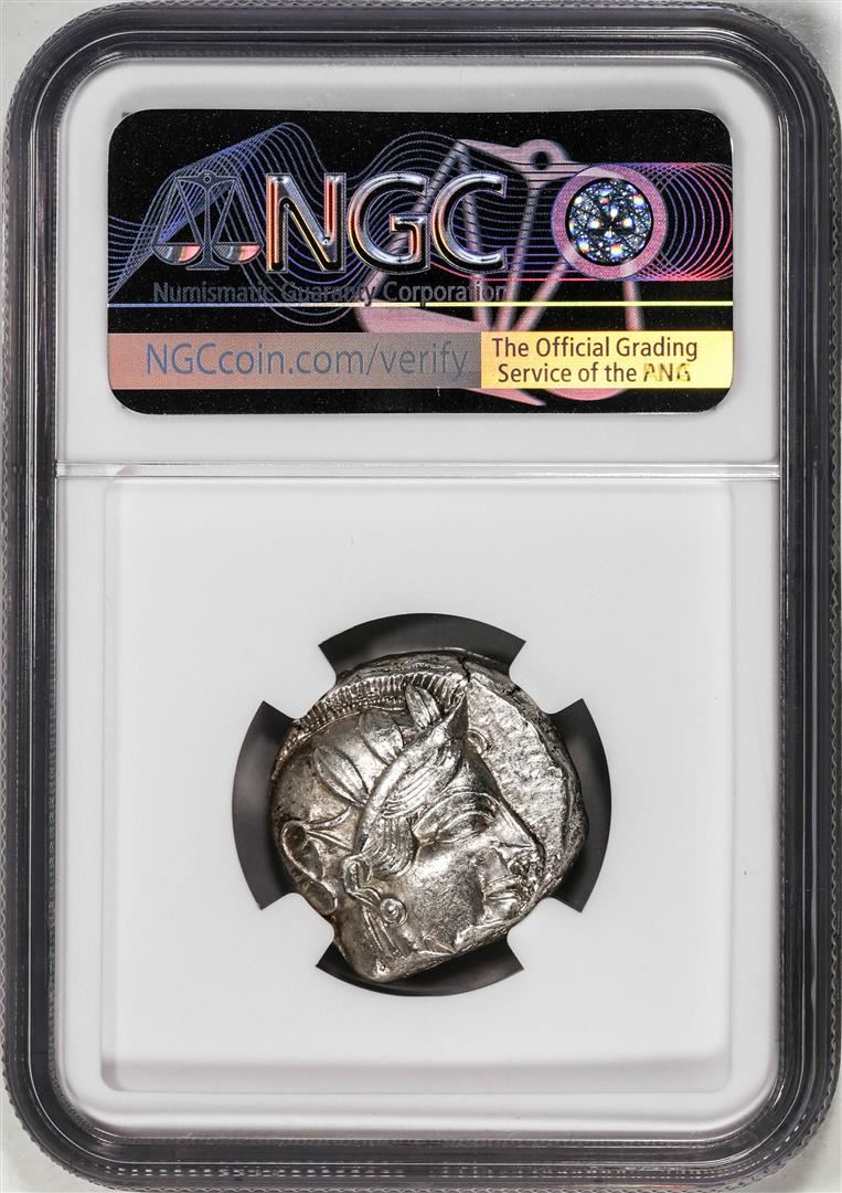 One Ancient Greek 440-404 BC Attica Athens AR Tetradrachm Athena Owl Coin NGC AU. NGC Certified.
