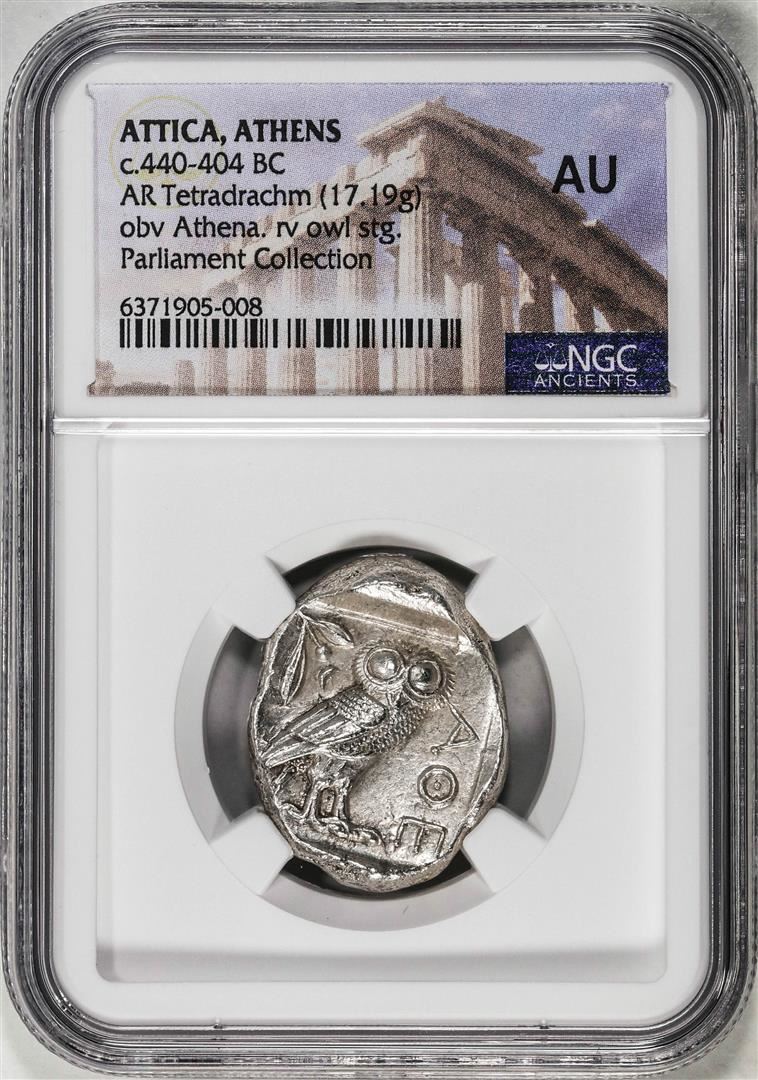 One Ancient Greek 440-404 BC Attica Athens AR Tetradrachm Athena Owl Coin NGC AU. NGC Certified.