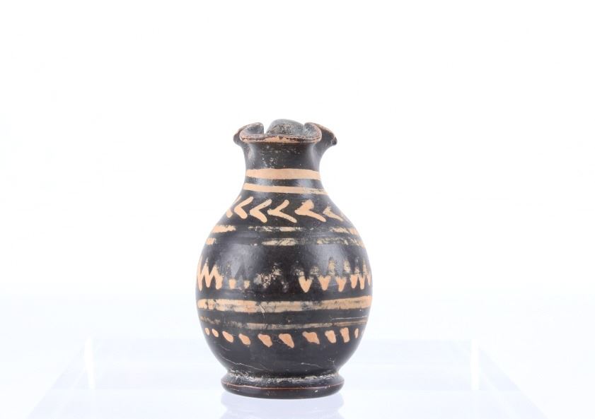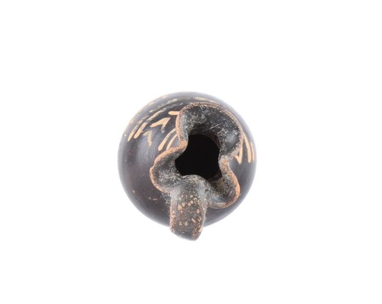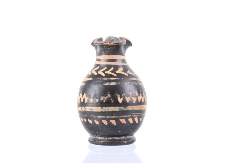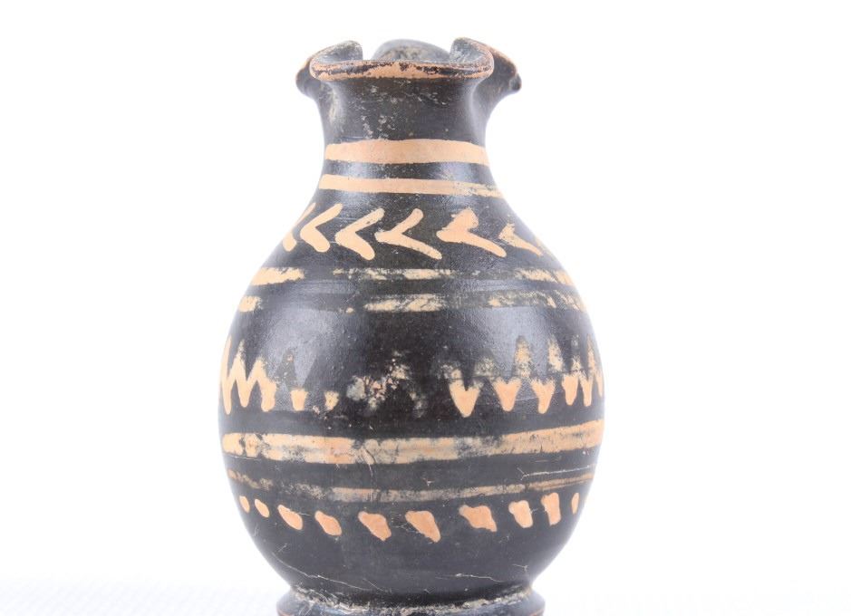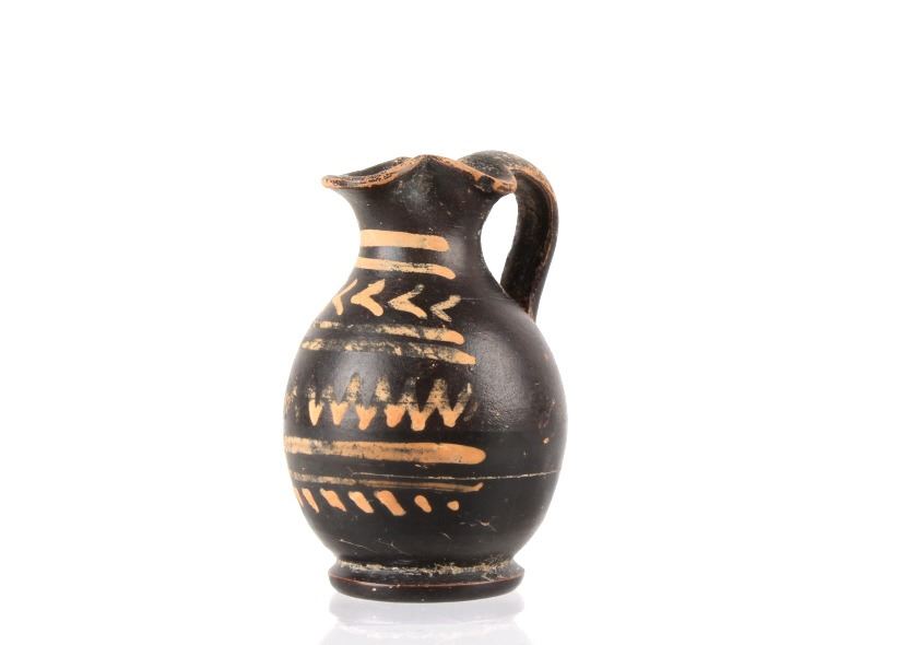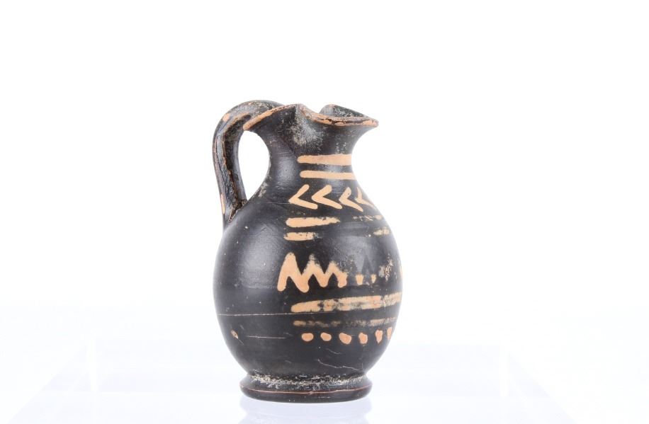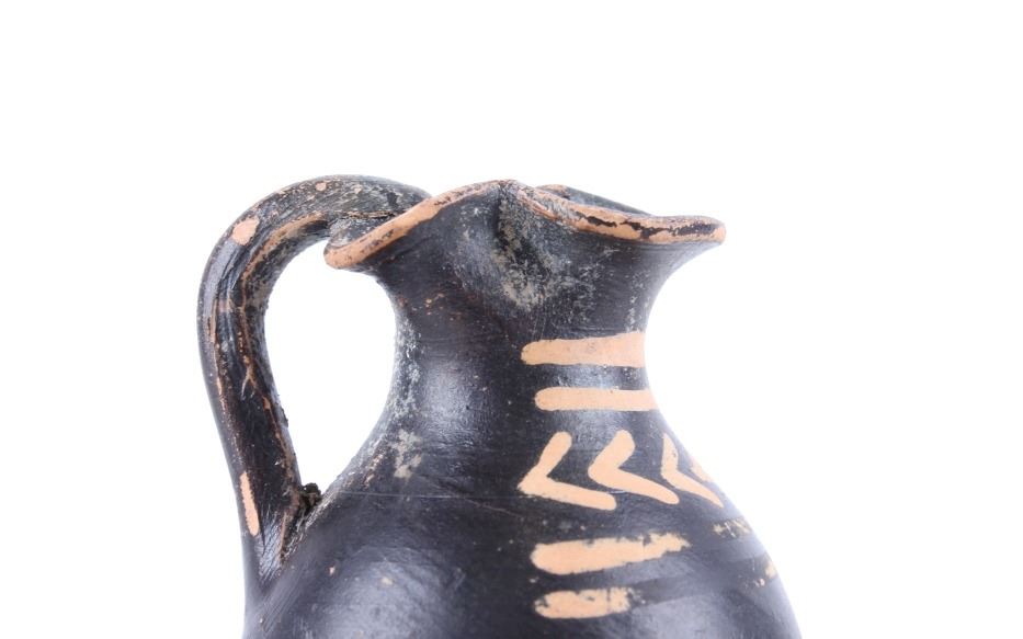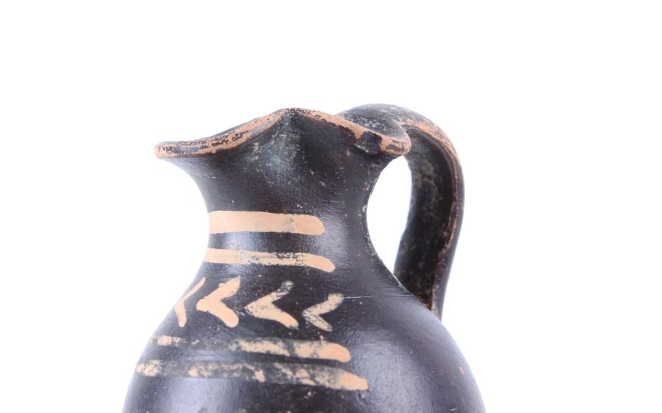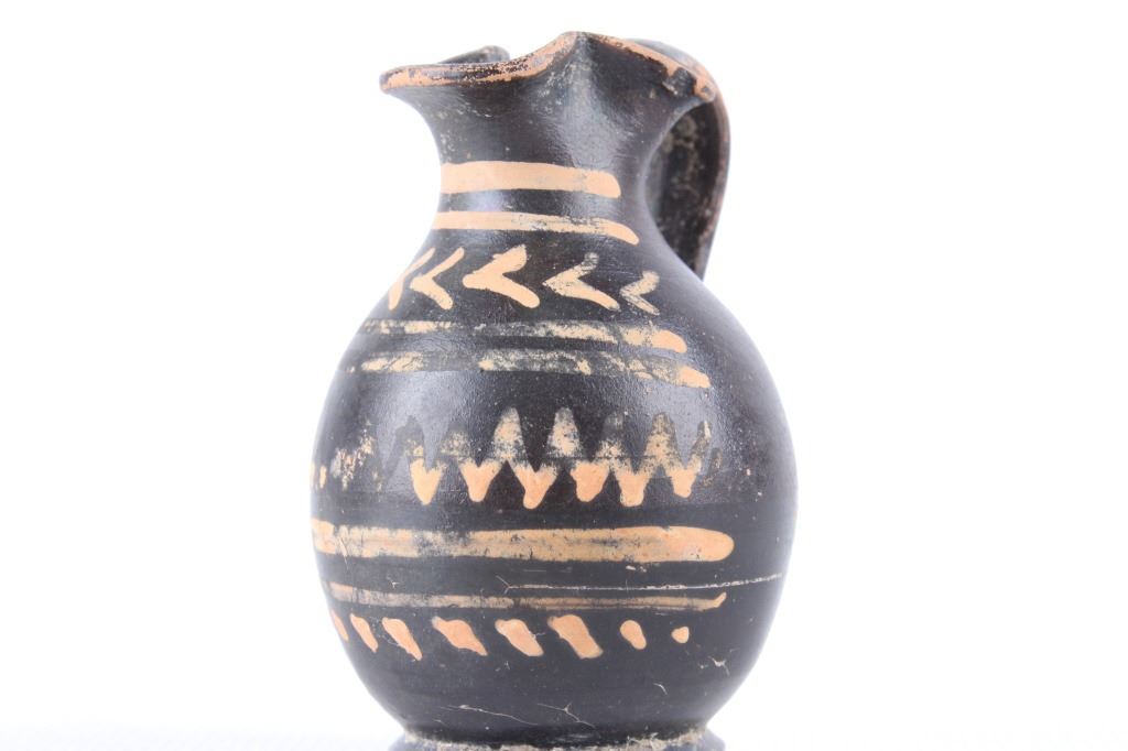 For your consideration is an Ancient Greek Decorated Chous Vessel ca. 400-100 BC. The small pottery pouring vessel sits on low ring base, with trefoil rim and attached strap handle behind, the bulbous body features a charming orange-red painted geometric and wave pattern design at front center. When Greek boys were 3 years old, they were given a chous, such as this example, filled with wine at Greek festivals like Anthesteria. They would be allowed to drink the wine to prove that they were on their way to becoming men. The chous was considered a toy pitcher for children, and is a tiny version of a olpe and oinochoe style pitchers. The Greeks used pottery vessels primarily to store, transport, and drink such liquids as wine and water. This piece is in good condition with some fading to the paint and along the rim and handle. It is believed to be circa 400-100 BC, and measures approximately 2 1/2" tall, and 1 1/2" wide across the body.