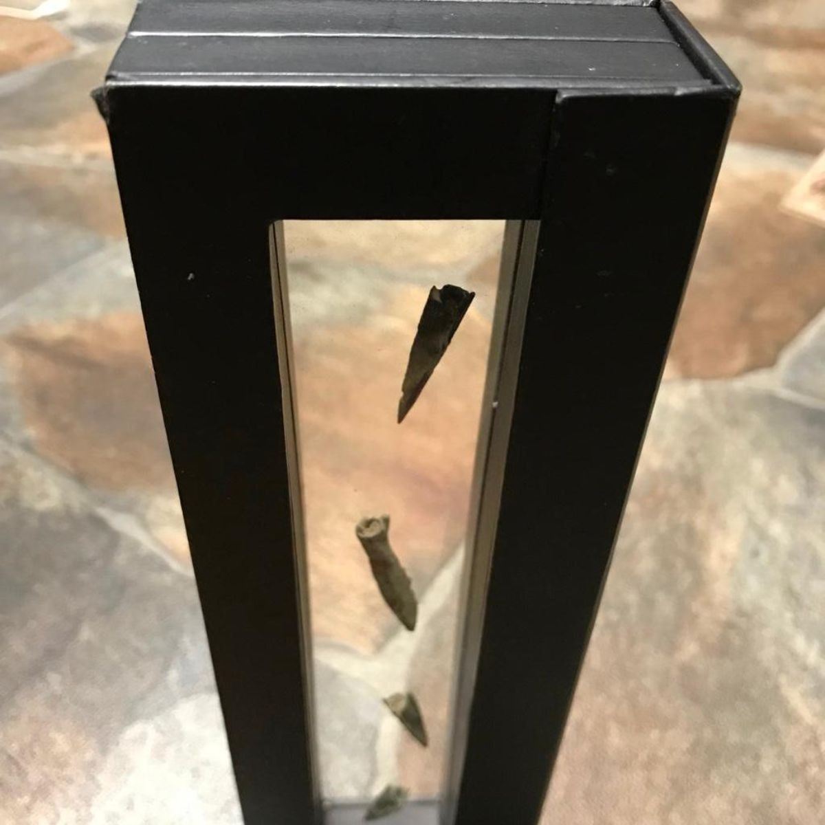 600 - 200 BC, Ancient Greek bronze arrowhead points, trilobe socketed-type, in excavated condition, displayed in artifacts case. Points range in size from  5/8" - 1 1/4" L. Case - 2 1/2" X 10". Â