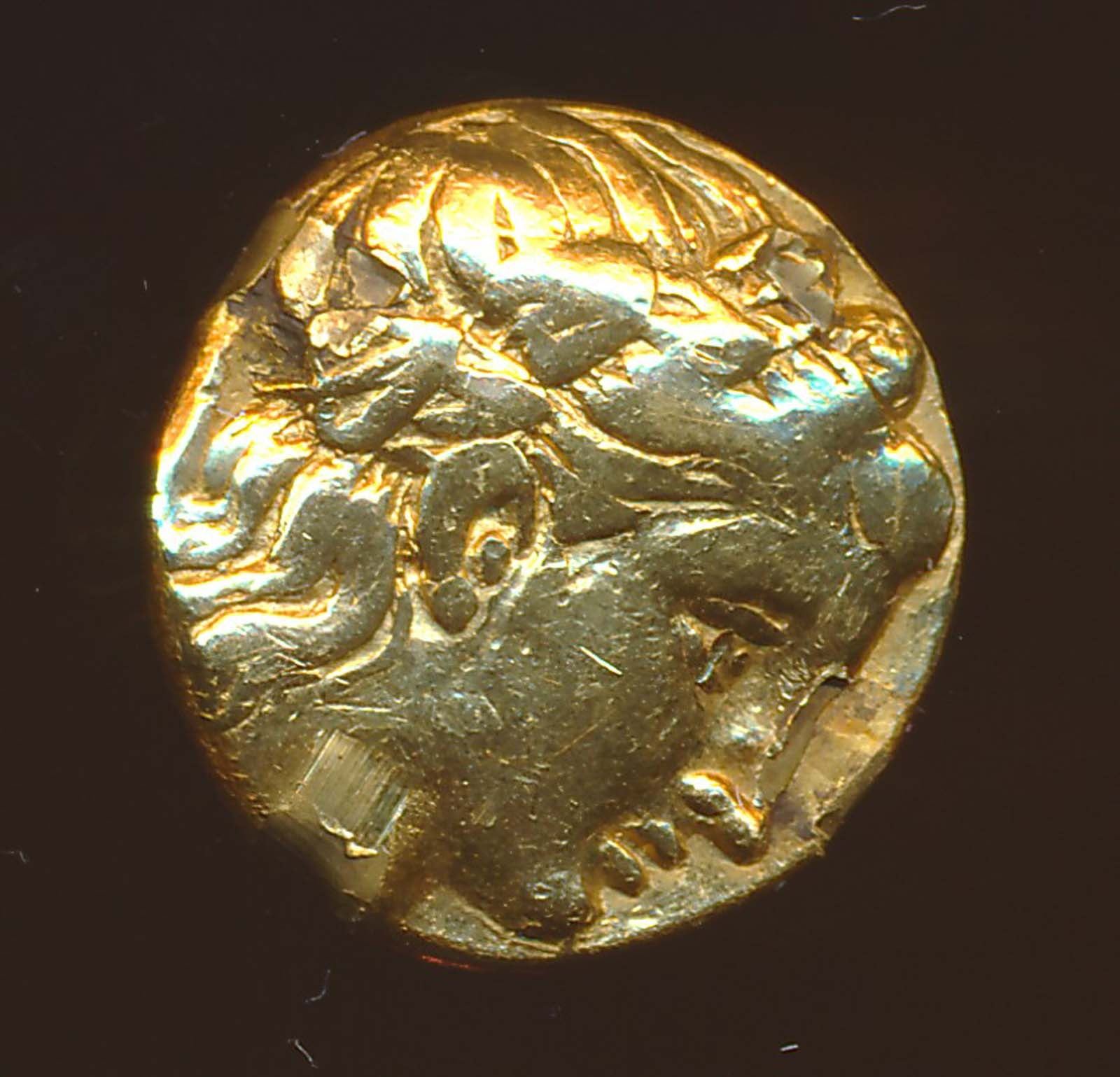 Struck C-400-335 BC, Rev.: is similar to silver drachms of this period, with Heracles kneeling, holding bow, town name to left. Weight is 3.93 gr. Obv.: Head of Heracles to right, in fine style, with youthful features. Unfortunately, this coin was rather roughly mounted in jewelry, and extensive pressure damage is evident. Still a handsome little piece, and quite rare. We have not been able to find another example with this obverse in any modern sale.