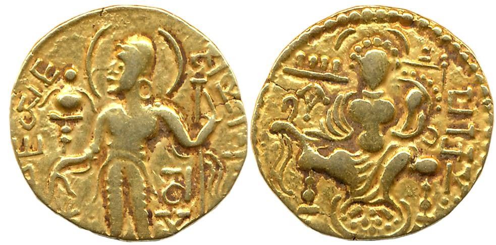 Guptas, Samudra Gupta, Gold Dinar, 7.70g, “Sceptre” (standard) type, Obv: King Nimbate standing and holding a royal sceptre (Rajadhanda) adorned with ribbon, Brahmi legend “Samudra” under arm in right field, filleted Garuda standard in the left, circular Brahmi legend “Samara satavitata…….”, Rev: Goddess Lakshmi, Nimbate sitting on the high back throne, holding cornucopia and noose, feet are resting on the circular mat, Brahmi legend “ Parakramah” in the right field, tamgha at left field. About very fine+, rare.