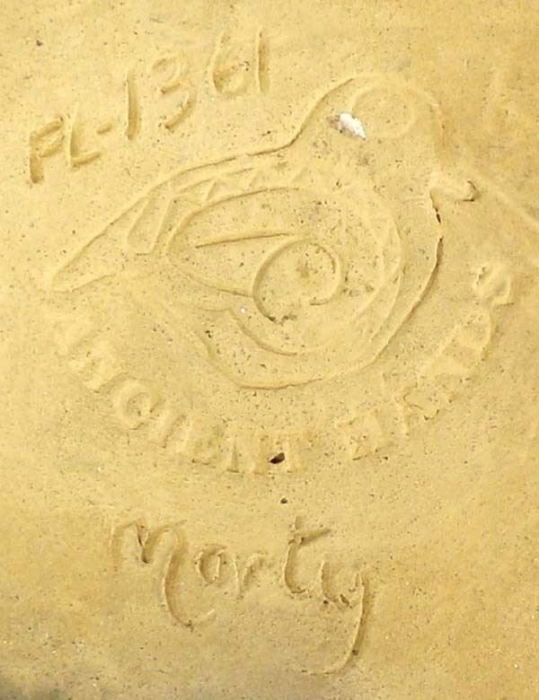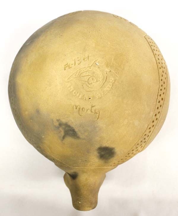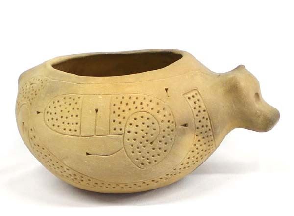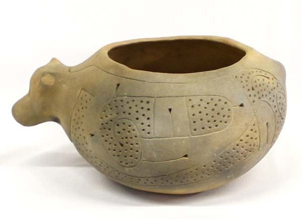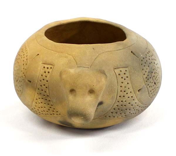 Ancient Hands Pottery by Marty Haythorn, measures 9'' X 7'' X 5'', left ear is chipped, FYI: “Contemporary artist (pottery), sculptor, ethnographic artist, and art educator: During the mid-70’s, Marty worked closely with ethnographic artist Ivan Gundrum for four years producing museum-quality reproductions of Southeastern Pre-Columbia’s pottery. He now designs and produces original pieces in the Southeastern tradition and continues to expand the collection of reproductions begun by Ivan Gundrum. He is the founder and principle artist of Ancient Hands. His work is exhibited internationally.”