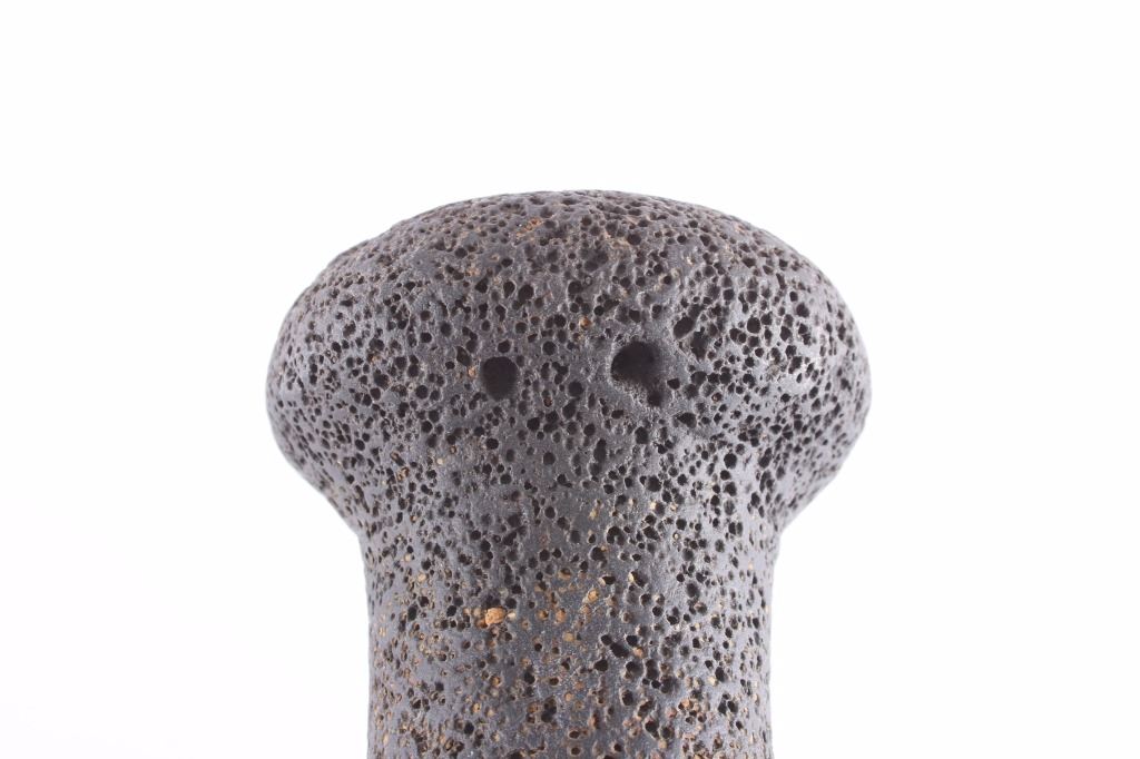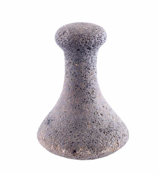 This is an ancient Hawaiian poi pounder artifact. The artifact is made from solid volcanic rock and was used to poi, a Polynesian staple food made from the taro plant. The poi pounder shows good condition. It measures 5" in diameter and is 7.5" tall.