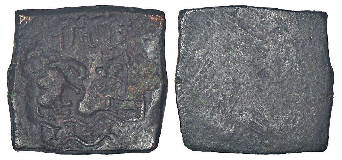 Ancient Central Malwa, Vidisha region - uniface inscribed copper punch-marked coin of Bhagila city-state (c.200-150 BC), PAIC 860, 6.91g. Obv: Four punches - 1. Bull walking to right, 2. Tree in railing, 3. Wavy lines with aquatic creatures swimming in between, 4. Brahmi legend Bhagilaya followed by a lotus symbol. Rev: Blank.