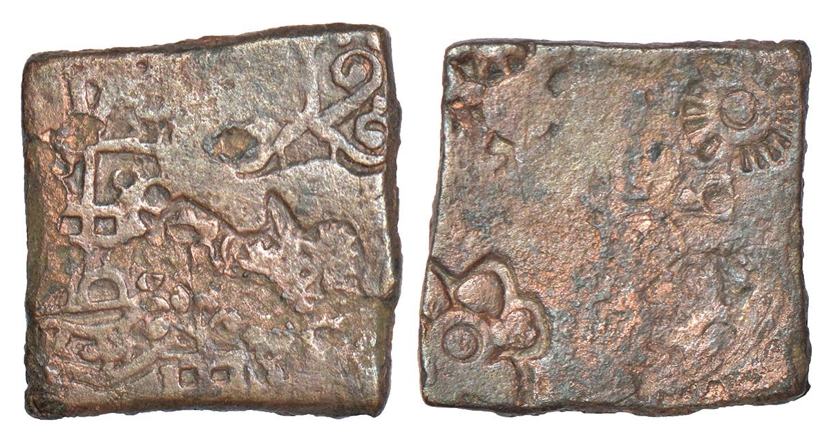 Although the coin is not inscribed, its attribution to Erikachha is certain through its symbolic configuration, fabric and typology. It is struck in an unusual manner, combining die-striking and punch-marking techniques.