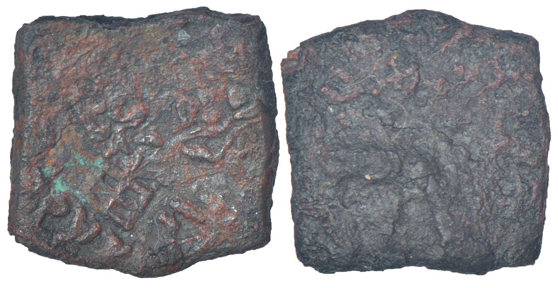Ancient Haryana - copper coin of 'Agodaka' city-state of the Agacha people, (c.100-50 BC), similar to PAIC 988 but square, 3.19g. Obv: A 'tree-in-railing' device in centre, Brahmi legend (Agodake) Agacha Jana… around. Rev: Lion seated facing right.