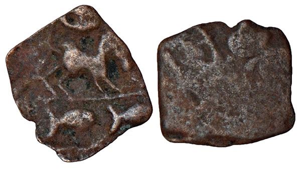 Ancient Khandesh / North Maharashtra, uninscribed die-struck coin of post-Mauryan period, unpublished type, (200-150 BC), 0.18g. Obv: Horse prancing to right, traces of a wheel above and two fishes below. Rev: Indistinct symbol, probably an open cross.