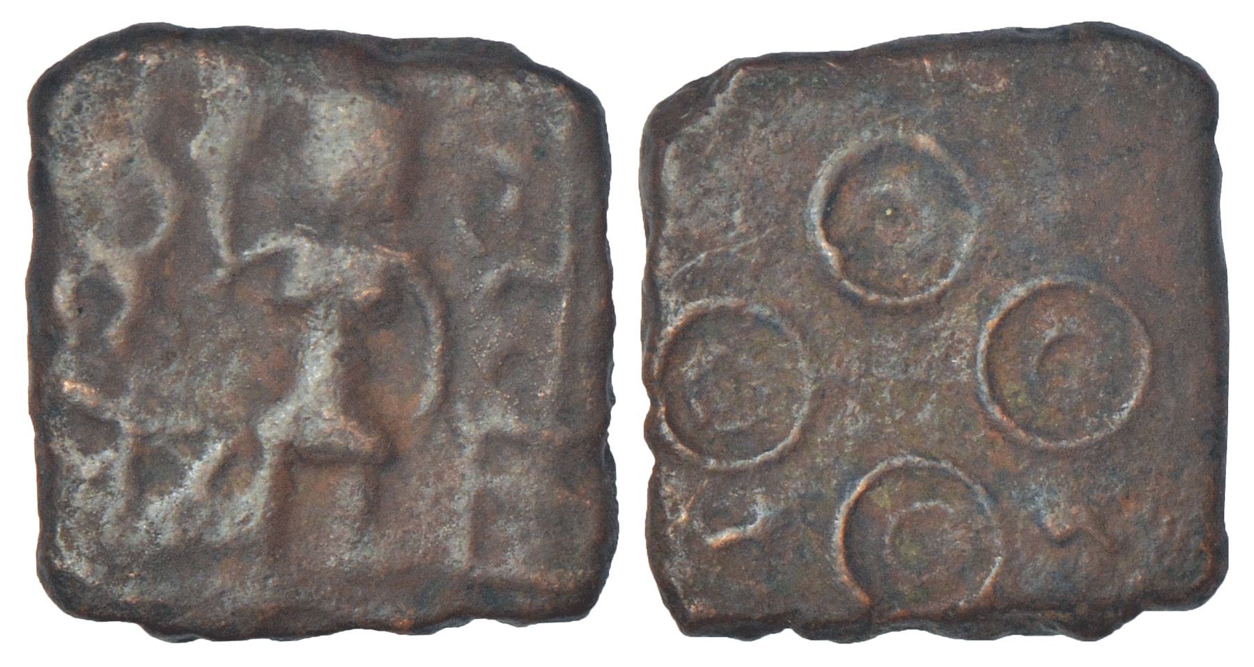 Ancient Malwa - post-Mauryan uninscribed die-struck copper coin of Ujjain/Mandasor area, 'goddess' type, (c.250-200 BC), PAIC 685, 3.88g. Obv: Goddess standing frontally with one hand on hip and holding a vase high in the other, small six armed symbol and triangle-headed standard to left, tree-in-railing to right. Rev: 'Ujjain' symbol with concentric orbs.