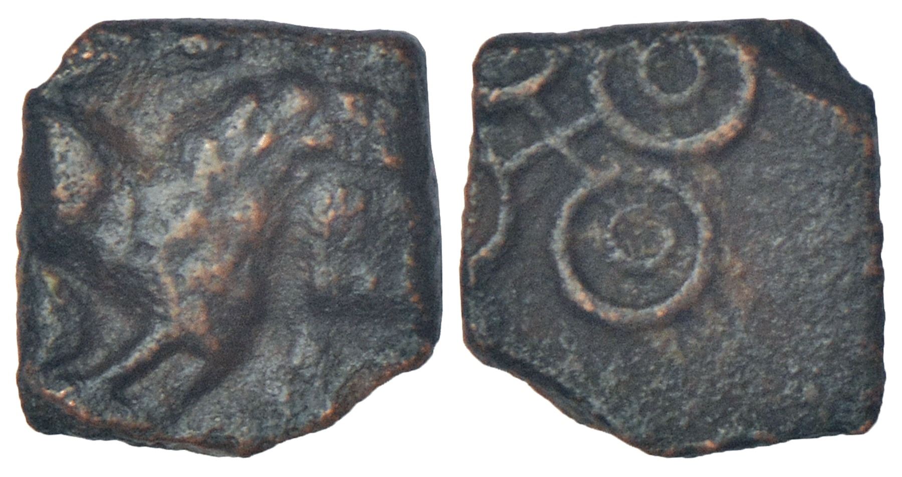 Ancient Malwa - post-Mauryan uninscribed die-struck copper coin of Ujjain/Mandasor area, 'lion' type, (c.250-200 BC), similar to PAIC 754, 0.97g. Obv: Maned lion facing right. Rev: 'Ujjain' symbol with concentric orbs.