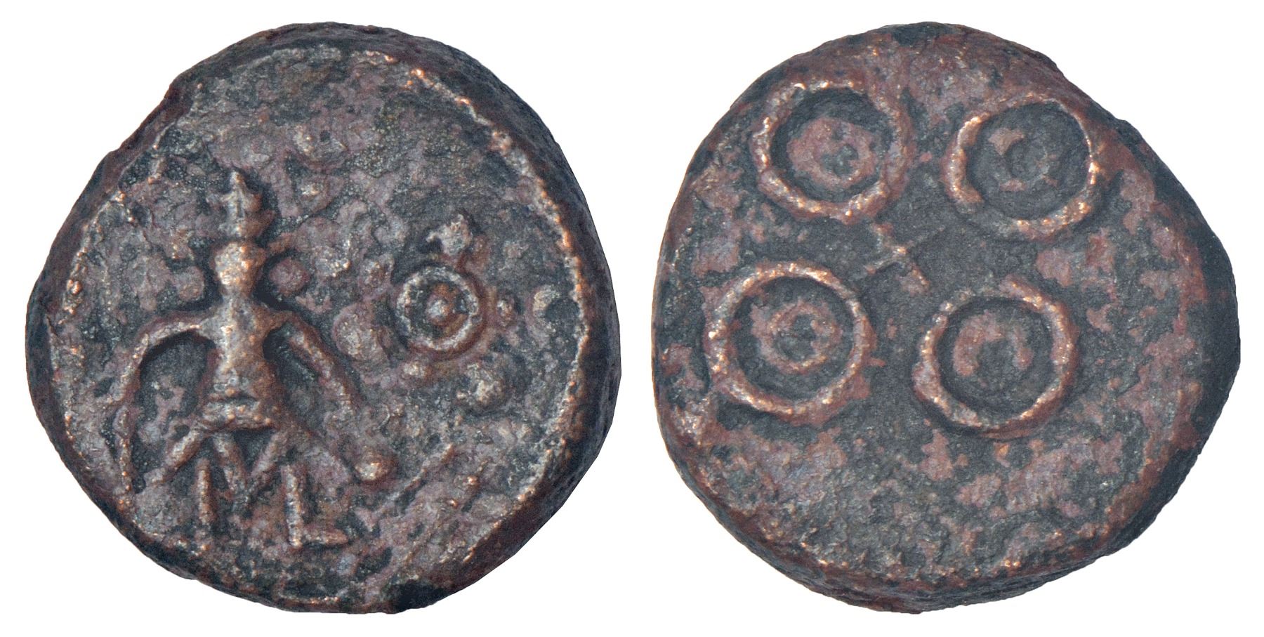 Ancient Malwa - post-Mauryan uninscribed die-struck copper coin of Ujjain area, 'standing man' type, (c.250-200 BC), PAIC 628, 8.17g. Obv: Man with staff and water-pot standing frontal, a six-armed symbol to right. Rev: 'Ujjain' symbol with concentric orbs.